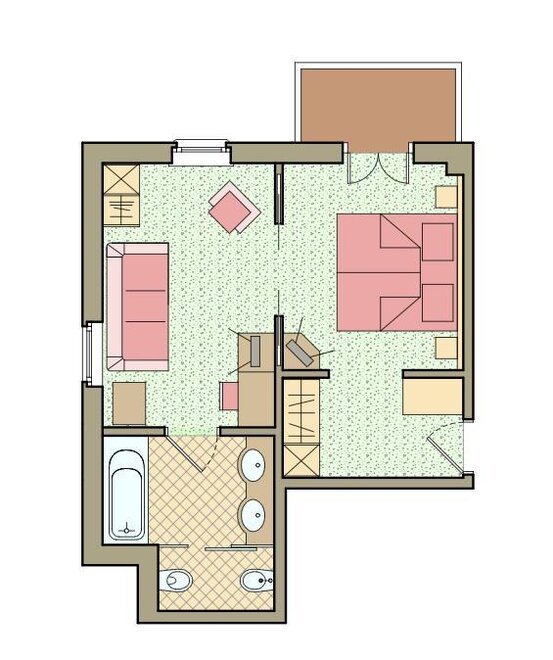 Camera arredata con stile legno abete testata decorata a mano esposta lato sud 2 letti, balcone (temperatura riscaldamento programmabile in camera) divanoletto, cassaforte, frigo bar, TV sat. connessione wireless, attrezzata di bagno wc-bidet doccia-asiugacapelli MT. 25-28