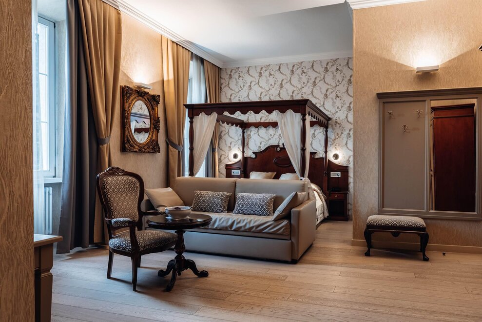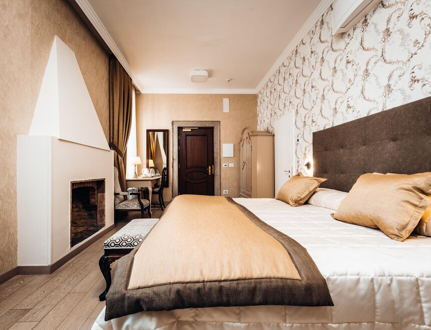 Per questo ogni stanza Madruzzo è unica, per dimensioni, forma e charme: la struttura di queste camere ricalca fedelmente quella originale della Villa, un bene inestimabile che non è stato modificato per mantenerne intatto il valore culturale e storico.