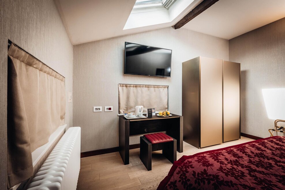 Le camere Mansarda dell’hotel si trovano al secondo piano della struttura storica e presentano ambienti dallo charme intimo e raccolto. Sono arredate in stile sobrio e con colori caldi. Le caratteristiche travi a vista e i pavimenti in legno, conferiscono a queste stanze dall’atmosfera suggestiva, un fascino semplice e genuino, ma al tempo stesso elegante e riservato. Dotate di ampi e moderni lucernari, queste camere sono la soluzione ideale anche per chi cerca una vista romantica sul cielo stellato.