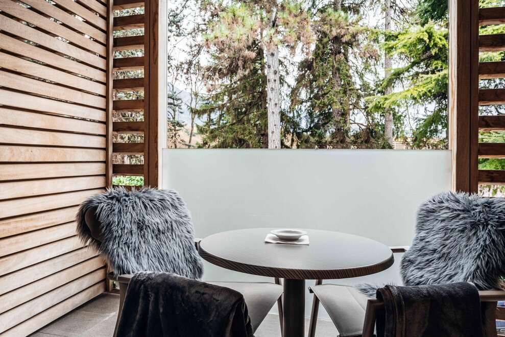 Le camere matrimoniali Garden, caratterizzate da un design moderno unito ad un sapiente uso del legno e dei materiali locali, affacciano su spaziosi balconi con vista sul panorama alpino e dotati di una vasca idromassaggio privata esterna.