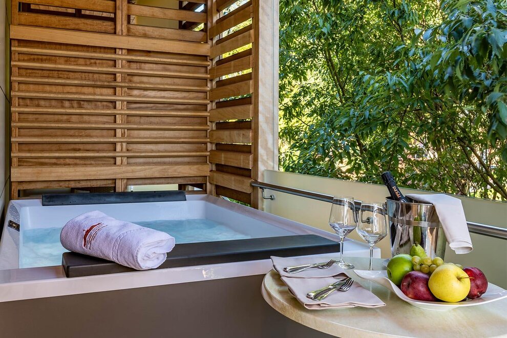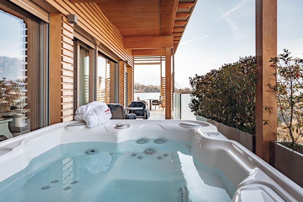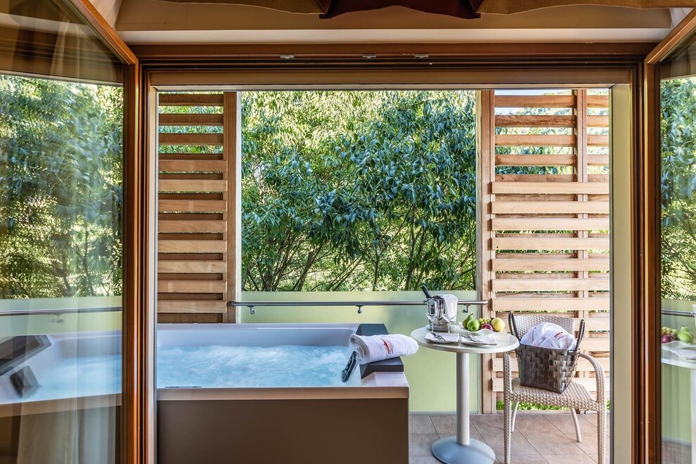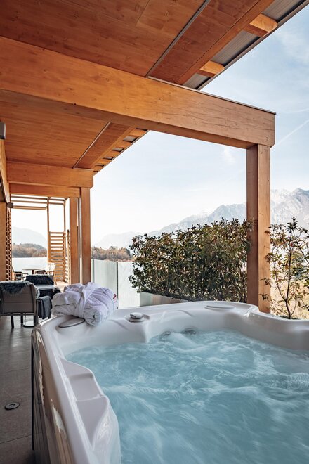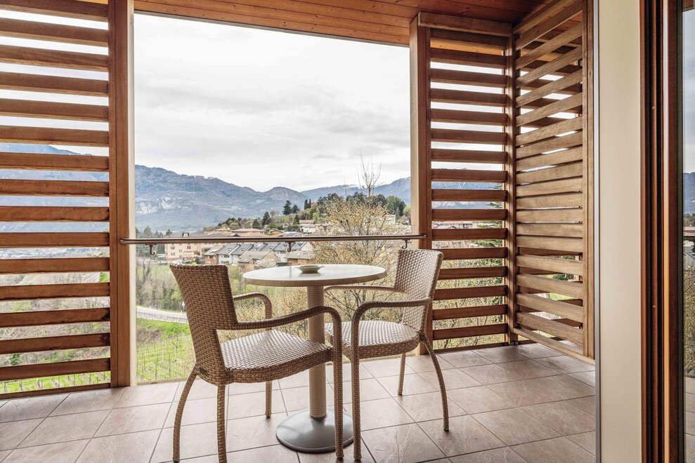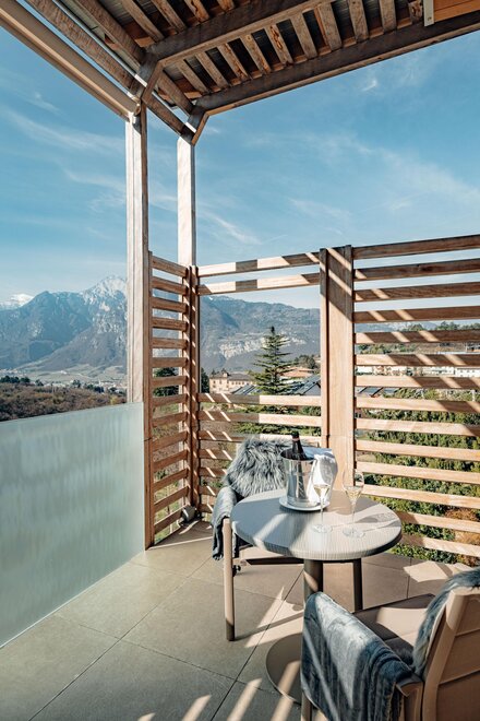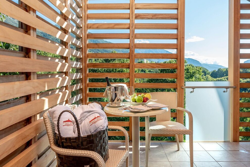 Ciò che contraddistingue ognuna delle tre Junior Suite Belvedere è l’incantevole panorama sulle colline e sulle montagne circostanti: potete goderne su un primo spazioso balcone, rilassandovi sulle confortevoli sdraio o immergendovi nell’idromassaggio esterno privato, oppure dal balconcino affacciato sui vigneti sottostanti, comodamente seduti al tavolino.