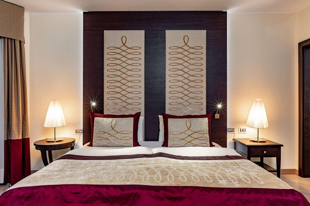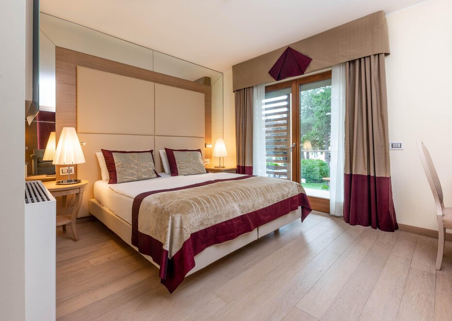Le camere matrimoniali Belvedere sono spaziose e confortevoli, arredate con uno stile moderno ed elegante, ma in armonia con il gusto classico di Villa Madruzzo.