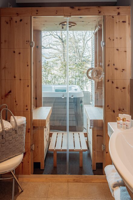 Il bagno principale è la vera sorpresa di questa camera: di fronte alla doccia, la sauna panoramica a due posti si affaccia sull’ampia terrazza con vasca idromassaggio privata. Da qui, o sdraiati sui lettini, potrete lasciarvi avvolgere dallo spettacolare panorama della valle e dei suoi vigneti.