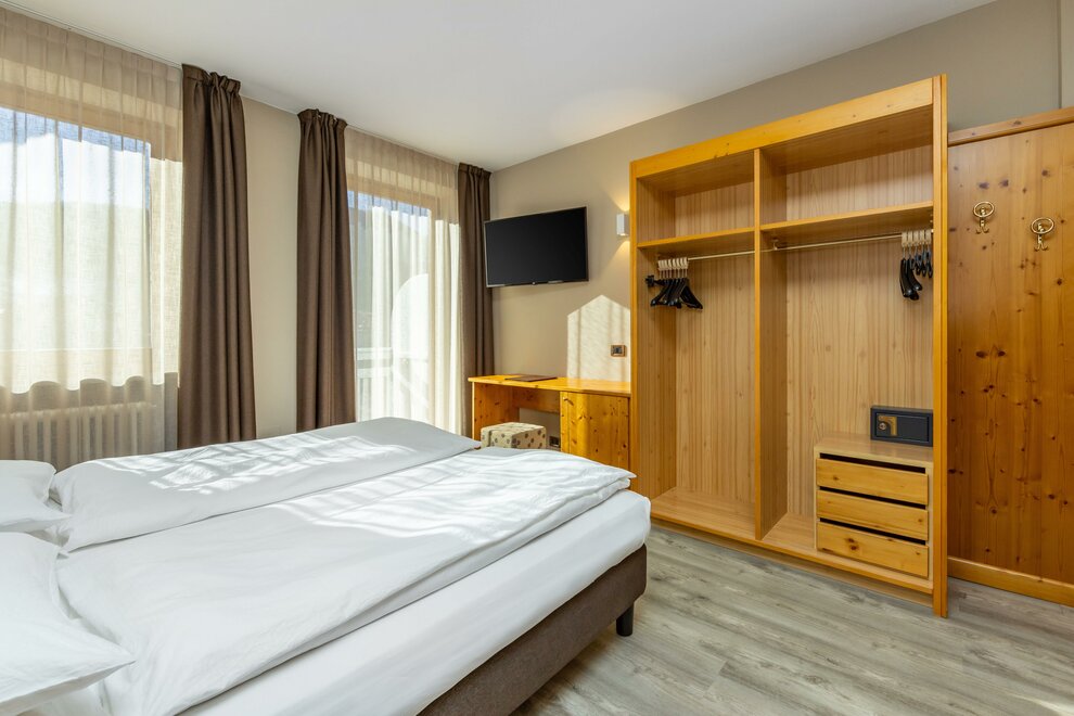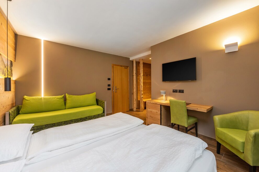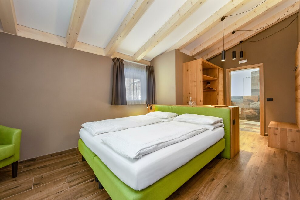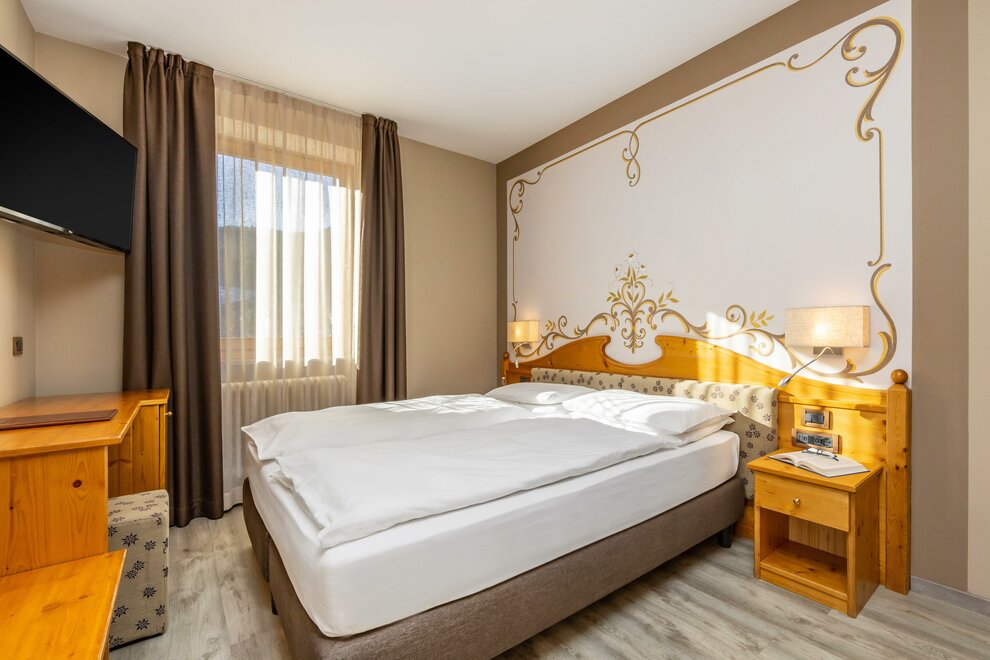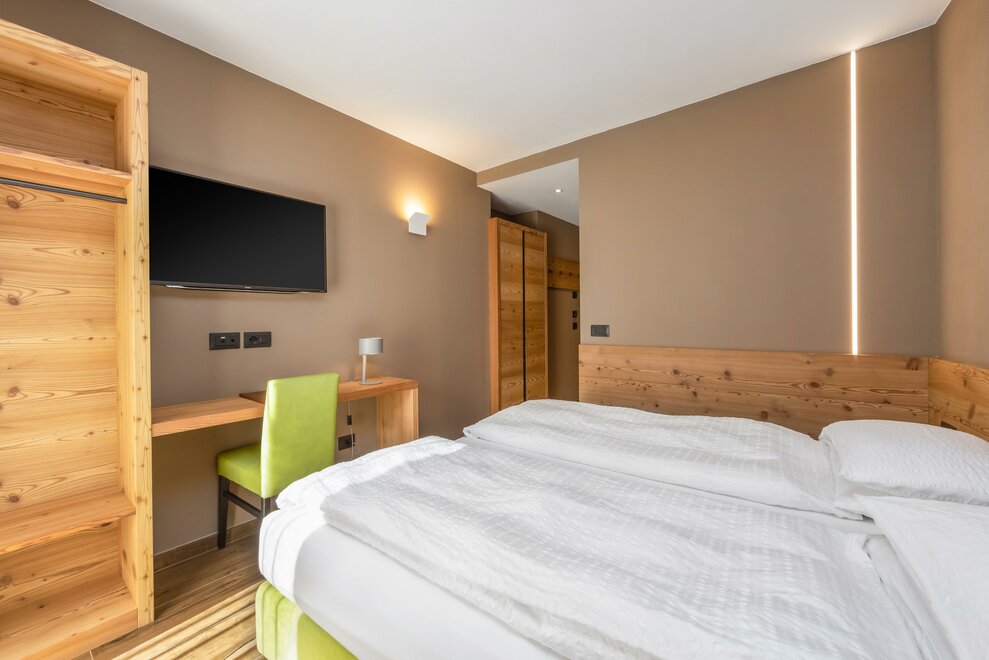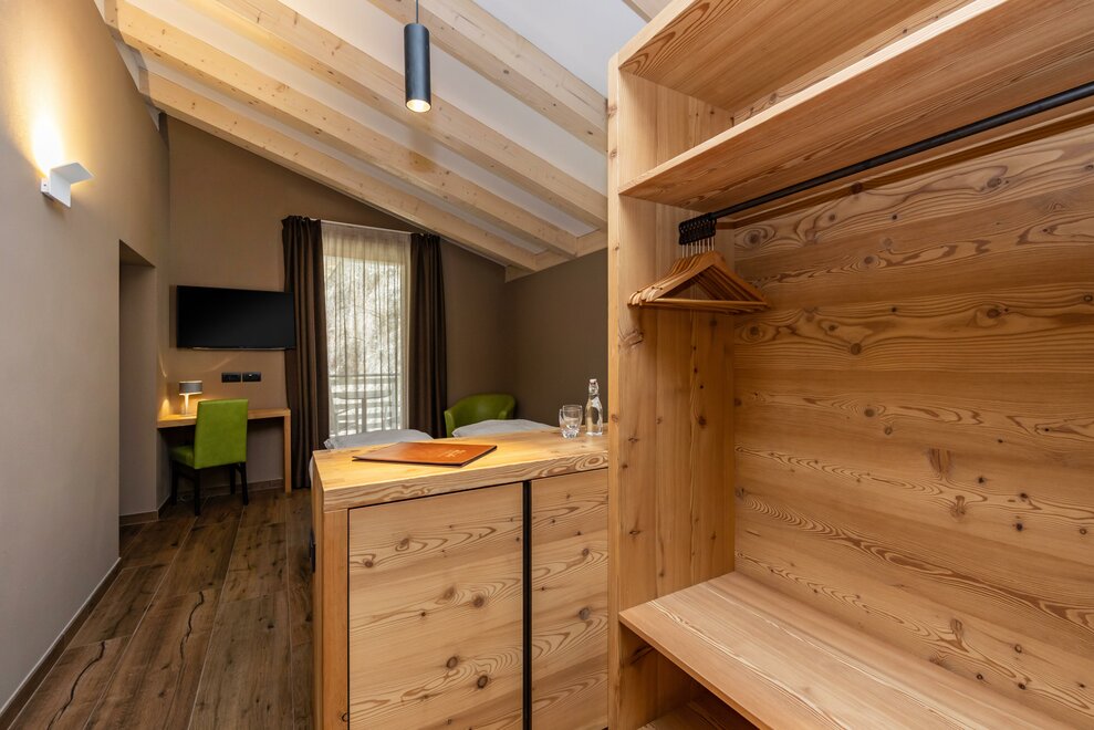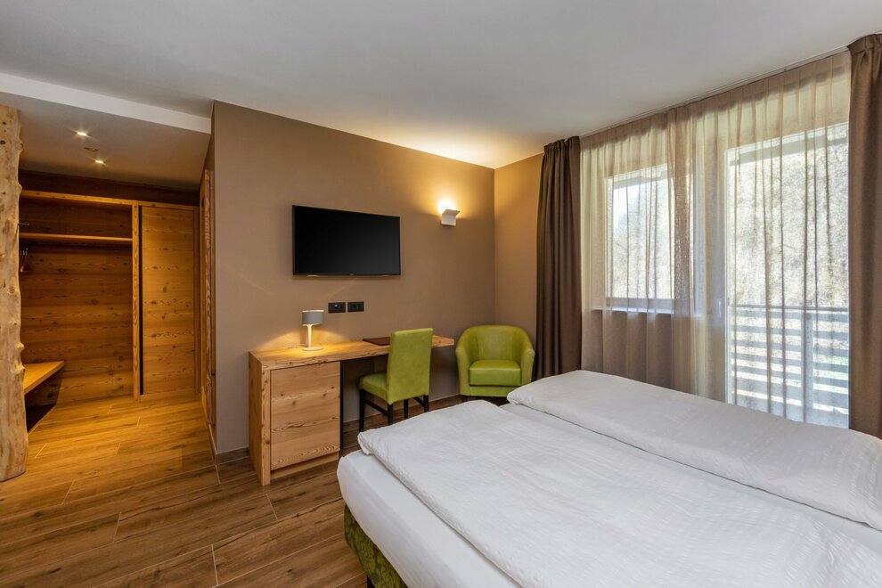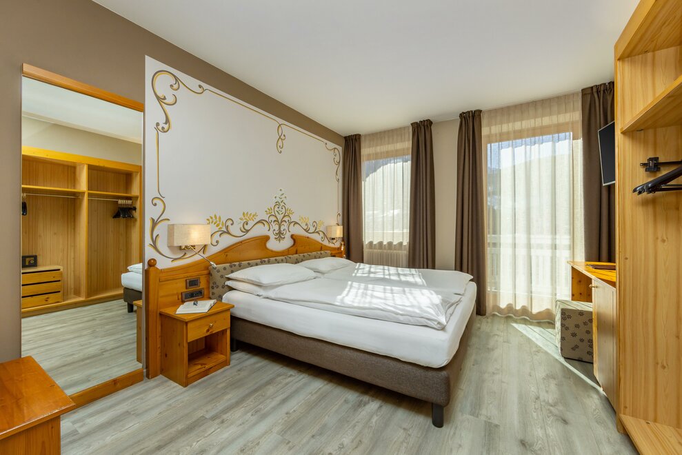 La Camera Deluxe, spaziosa, dispone di un’ampia cabina armadio, balcone ed è caratterizzata dalla tranquillità che favorirà il vostro riposo. Può ospitare fino a 4 persone in divano letto a castello. Ricca di legno e profumata al cirmolo, è la camera perfetta di un hotel di montagna. Bagno spazioso, finestrato