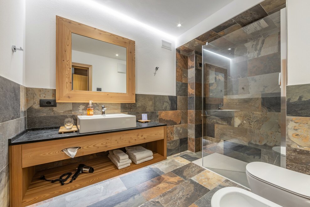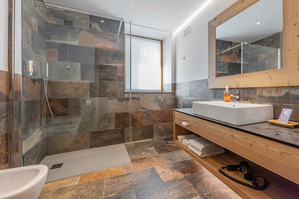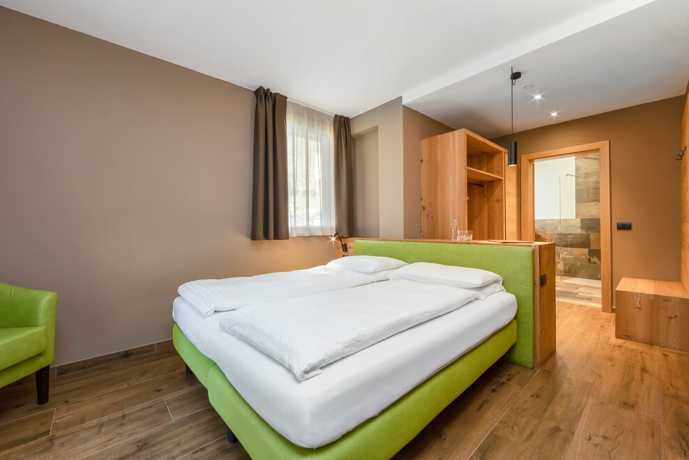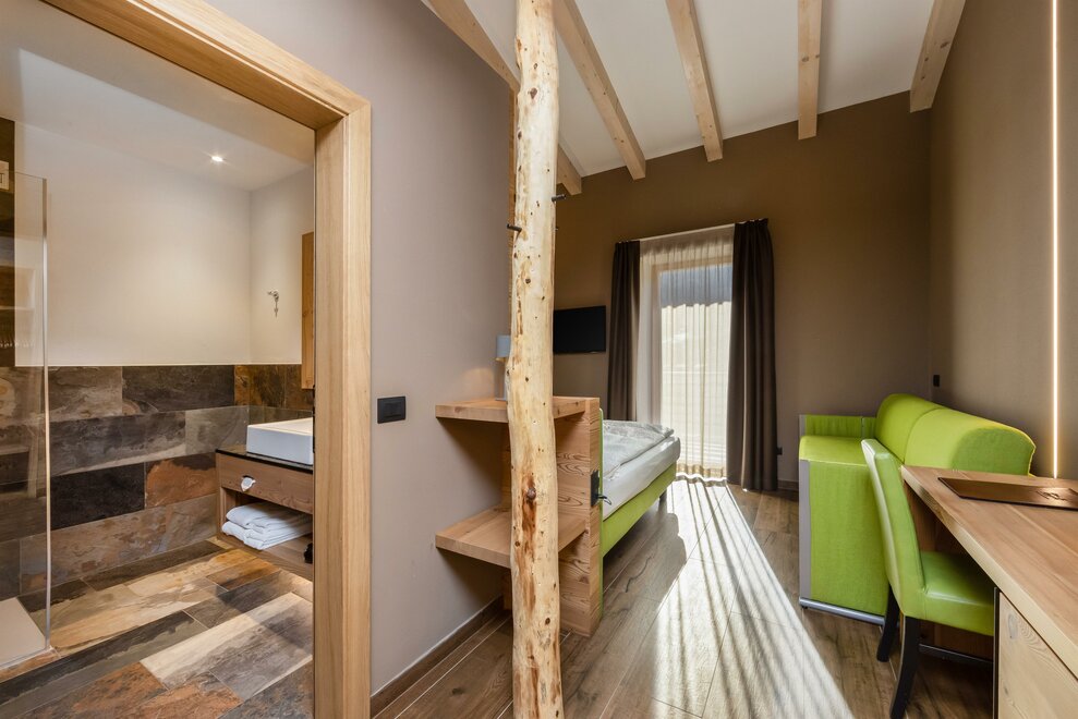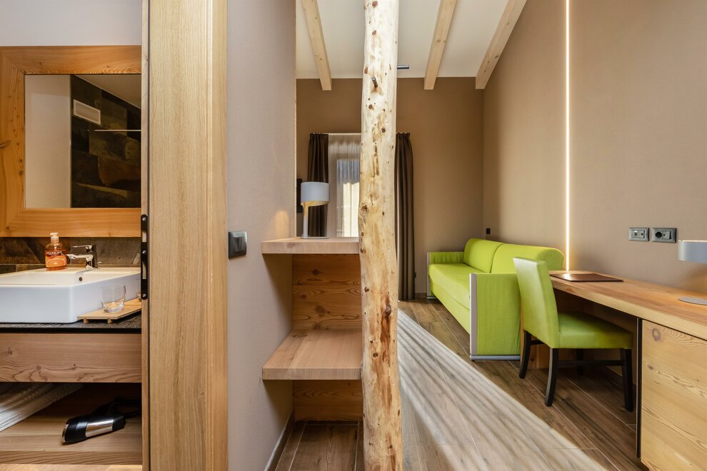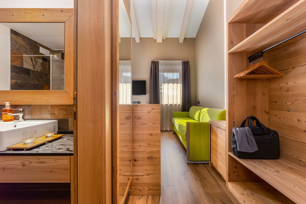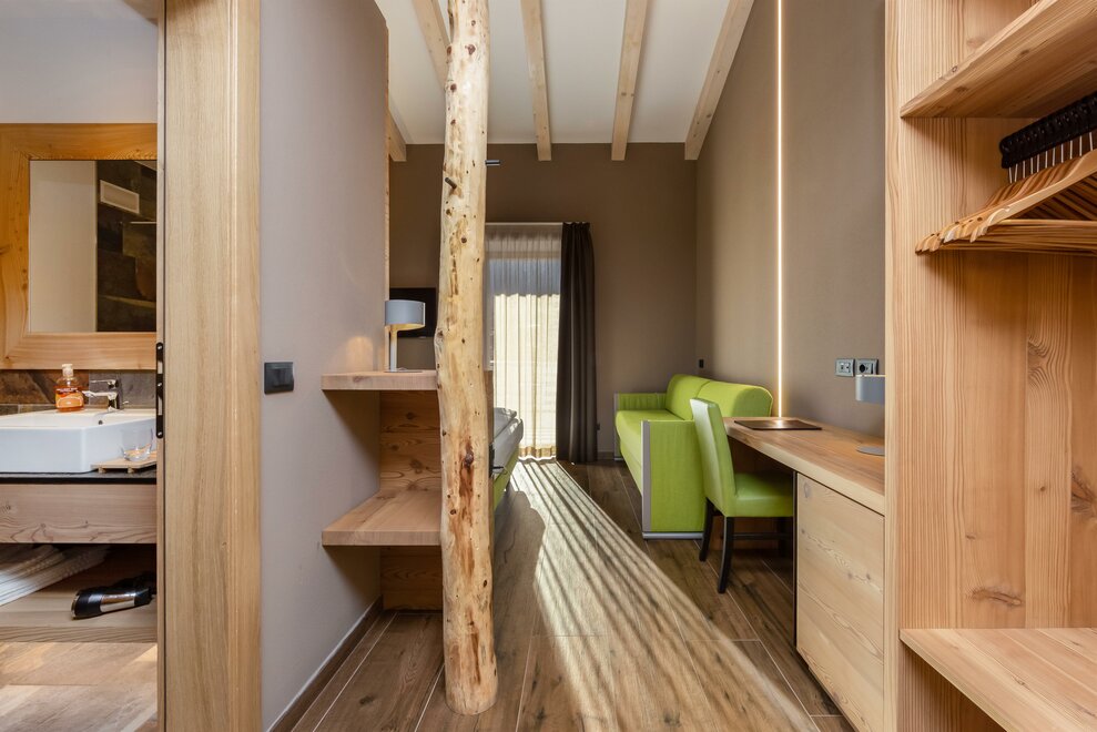 La Camera Deluxe, spaziosa (27 mq), dispone di un’ampia cabina armadio, balcone e comodo divano ed è caratterizzata dalla tranquillità che favorirà il vostro riposo. Ricca di legno e profumata al cirmolo, è la camera perfetta di un hotel di montagna. Bagno spazioso, finestrato.