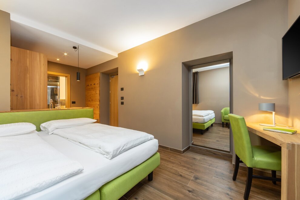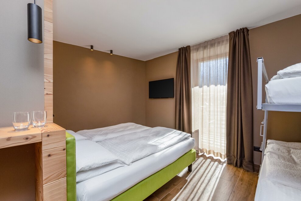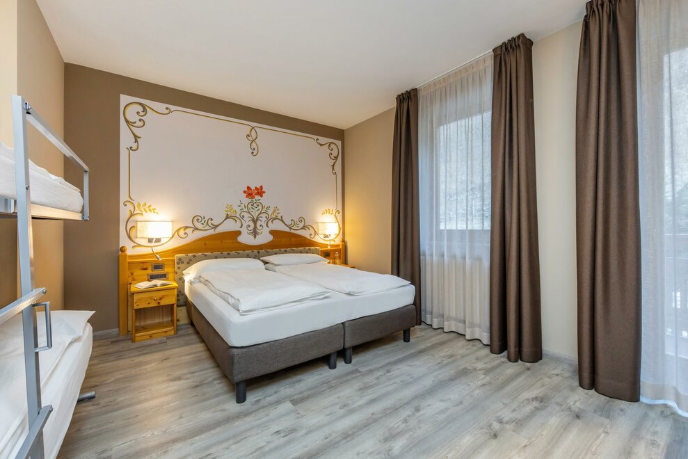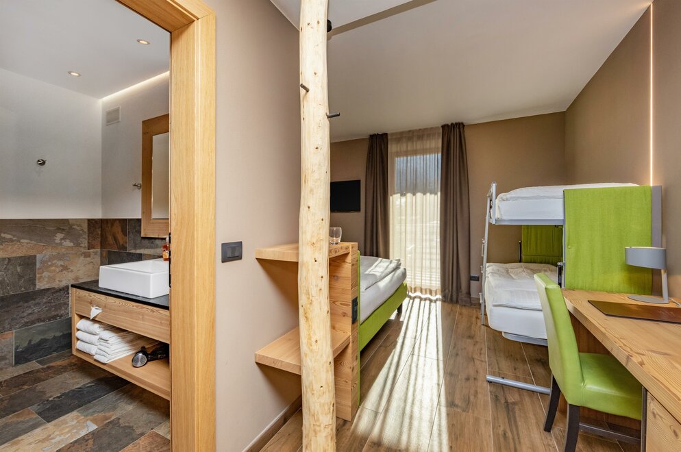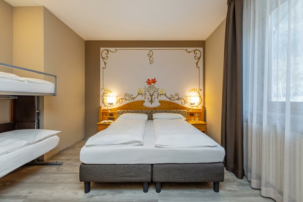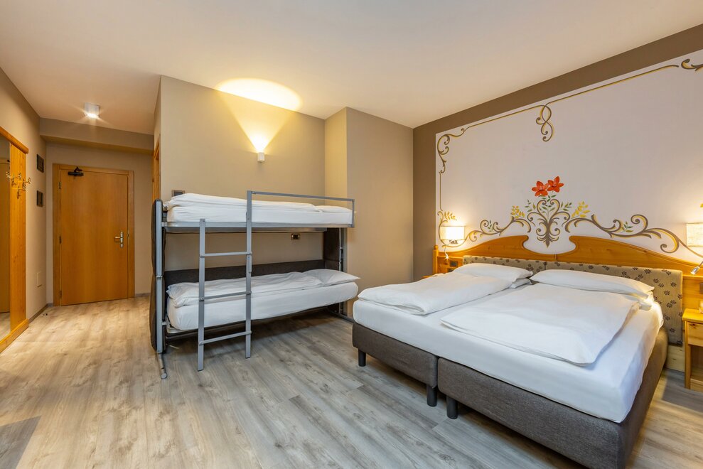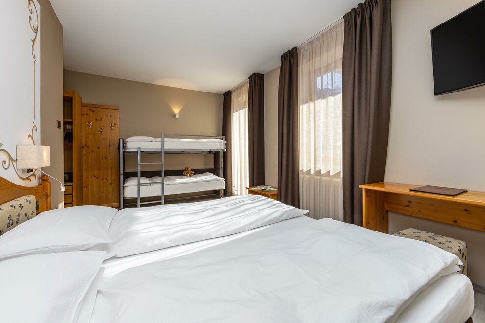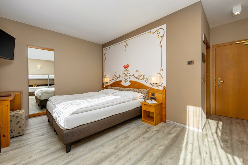 La Camera Standard Quadrupla nel nostro hotel per famiglie in Val di Sole è molto spaziosa (32 mq), dotata di comodo divano letto a castello. Con ampio balcone e mini frigo.