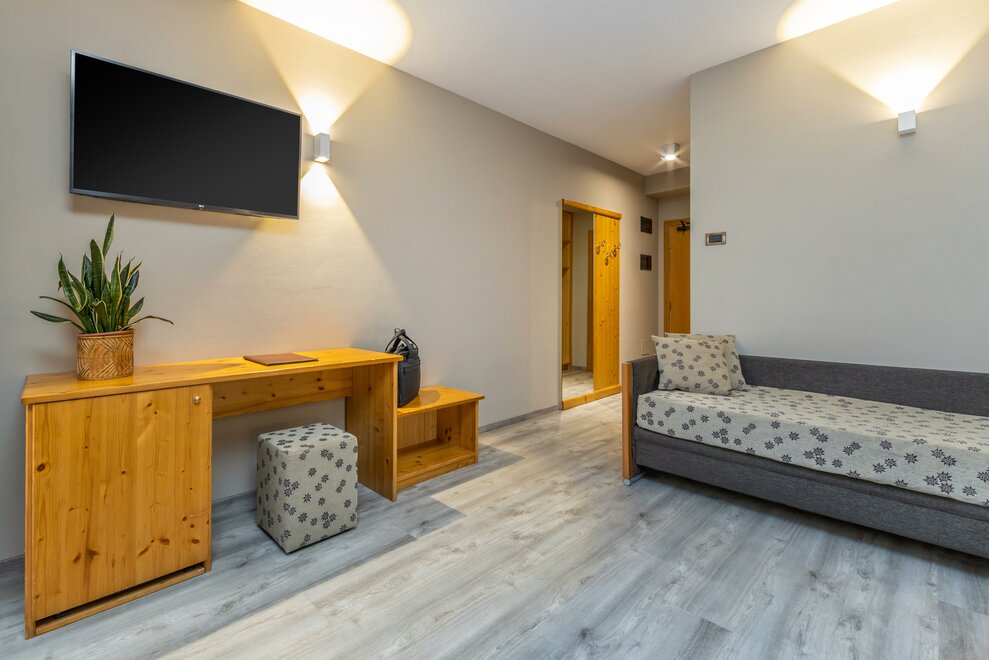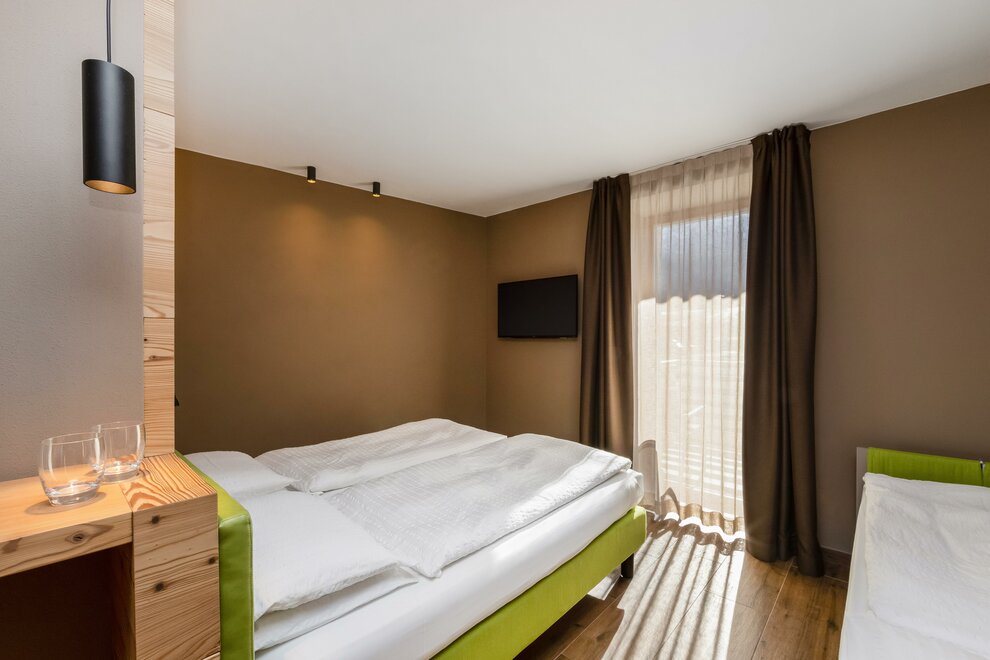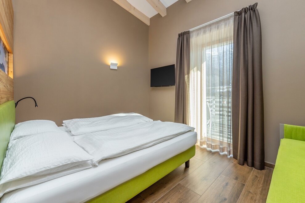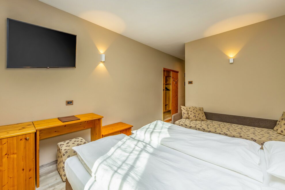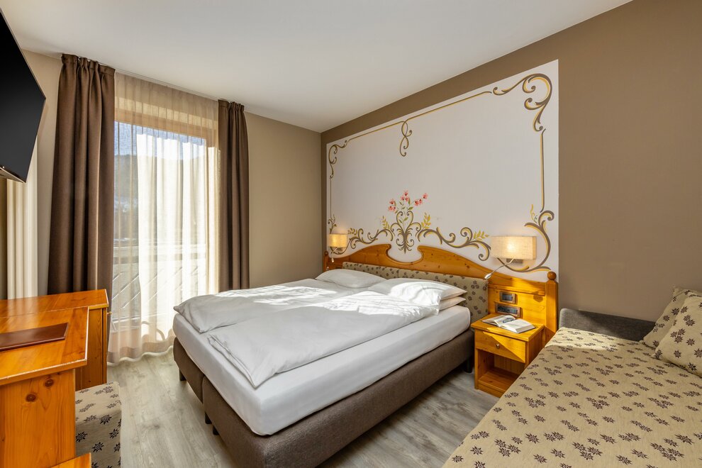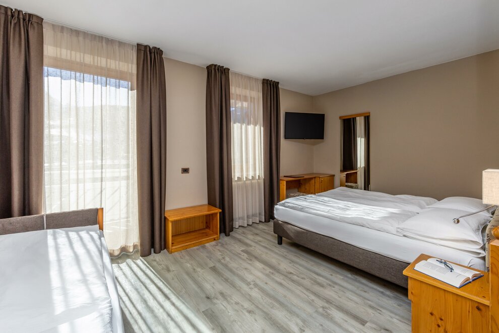 La Camera Standard Tripla nel nostro hotel per famiglie in Val di Sole è spaziosa (27 mq) e dispone di comodo divano e mini frigo. Luminosa, soleggiata e con balcone con vista sulle Dolomiti di Brenta versante Trentino. Può ospitare da 3 fino a 4 persone in divano letto a castello.