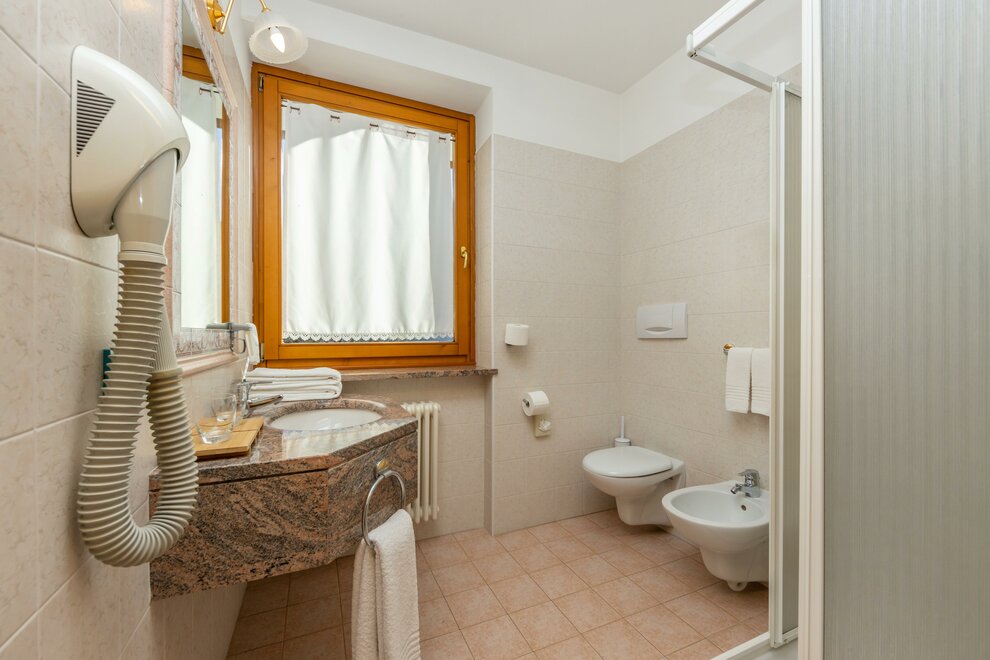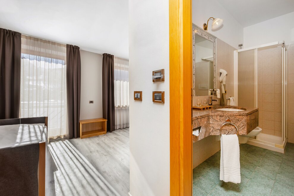 La camera tripla Superior nel nostro albergo 3 stelle Trentino con vista Dolomiti di Brenta, è ampia e luminosa, esposta a sud e con balcone. Dotate di comodo divano, con possibilità di ospitare fino a 3 persone in divano letto a castello. Alcune camere al secondo piano hanno travi in legno “a vista”, che rendono le stanze ancora più caratteristiche. I bagni delle camere triple Superior sono ampi e moderni, alcuni molto luminosi con finestra.