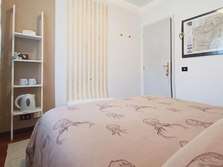 Camera con letto matrimoniale e piccola zona lettura interna alla stanza. La soluzione è dotata di bagno privato e si trova situata al piano terra del Bed and Breakfast. La stanza offre la vista sul giardino esterno e le montagne della Val Rendena.