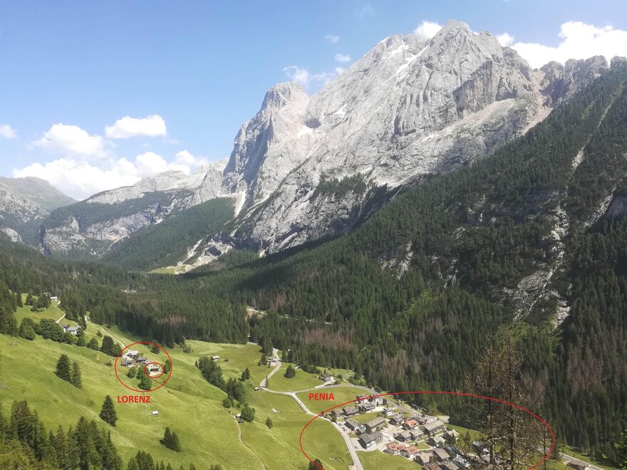 Cèsa Guli e Vitti è una casa unifamiliare con giardino, situata nel piccolo paese montano di Lorenz; adiacente al paese di Penia (dista solo 5 minuti sia in auto che a piedi).