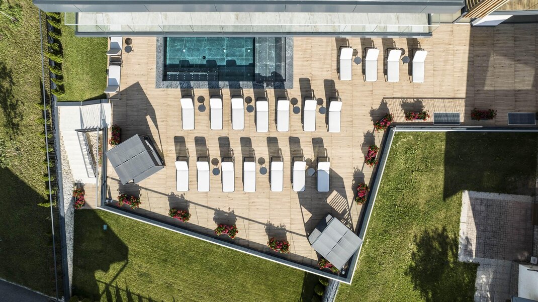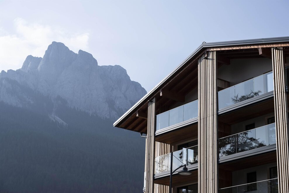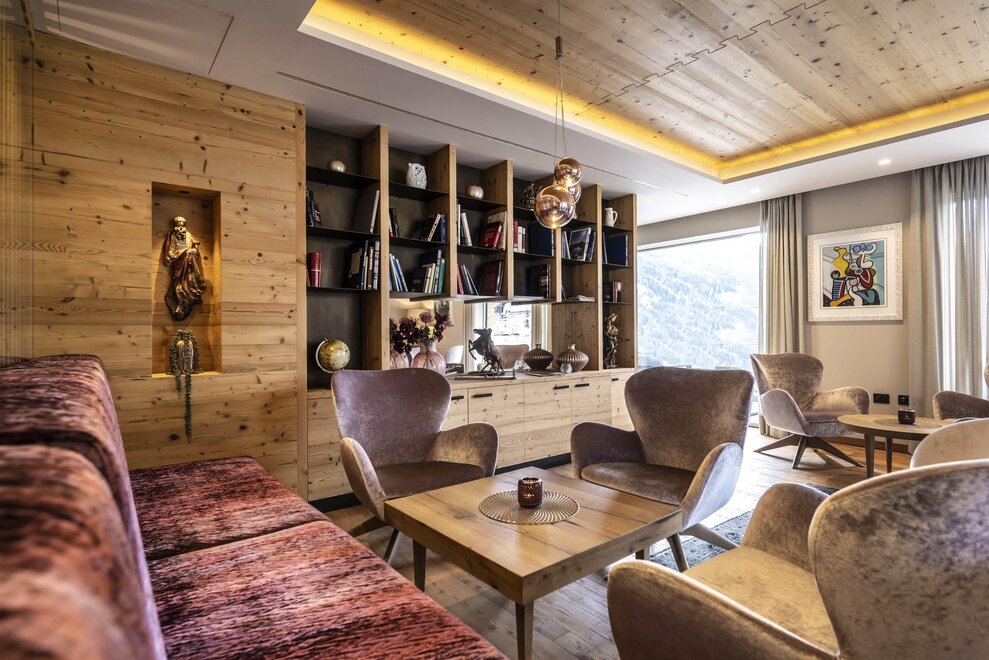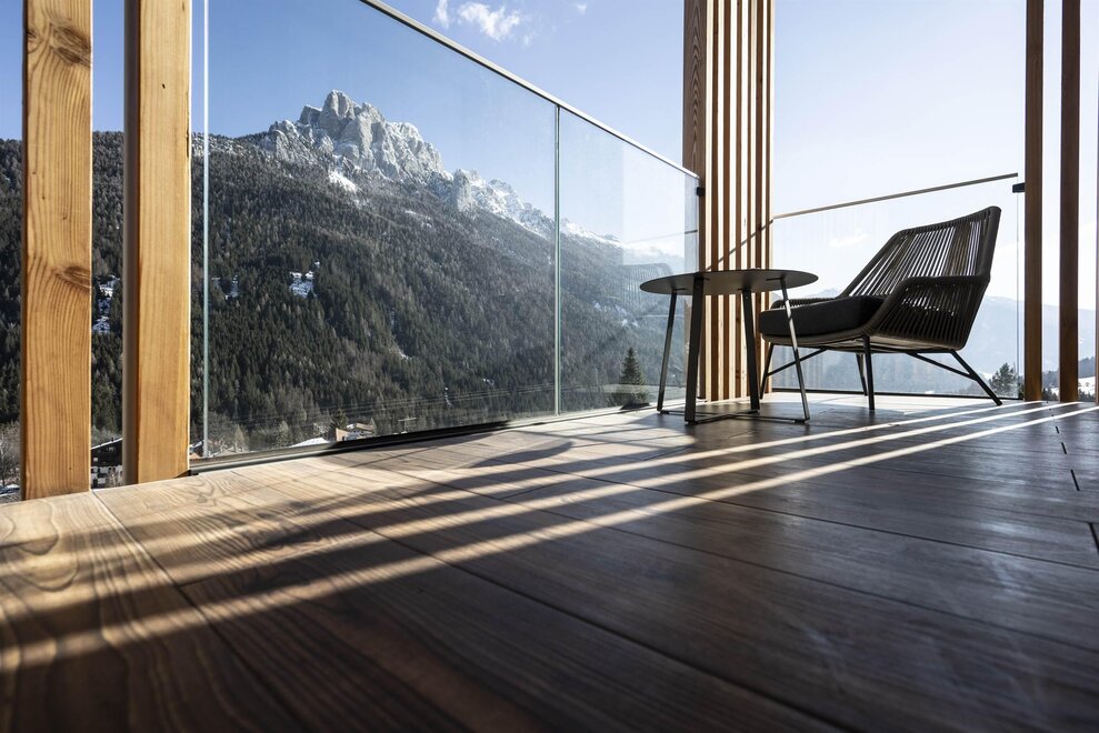 Junior suite con vista panramica di 30 mq in legno vecchio o in larice nordico con pavimento in legno, divano letto, LCD-TV, cassaforte, telefono, frigo bar, bollitore, Wi-Fi gratuito, balcone o terrazzo con vista mozzafiato sulle Dolomiti attrezzato con sedie reclinabili e tavolino. Bagno (aperto o chiuso) con ampia doccia, accappatoi e ciabattine, asciugacapelli, specchio cosmetico. Posto auto in garage riservato.