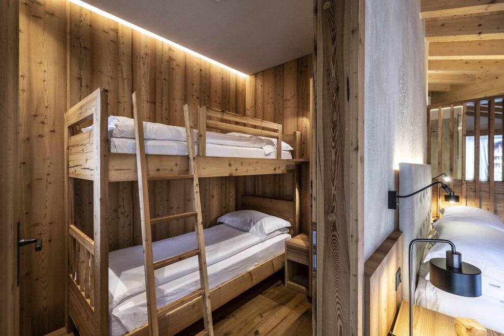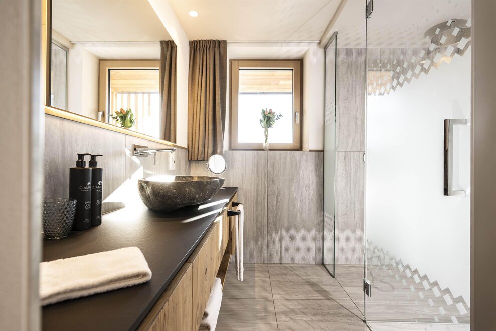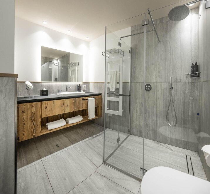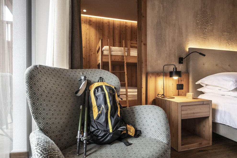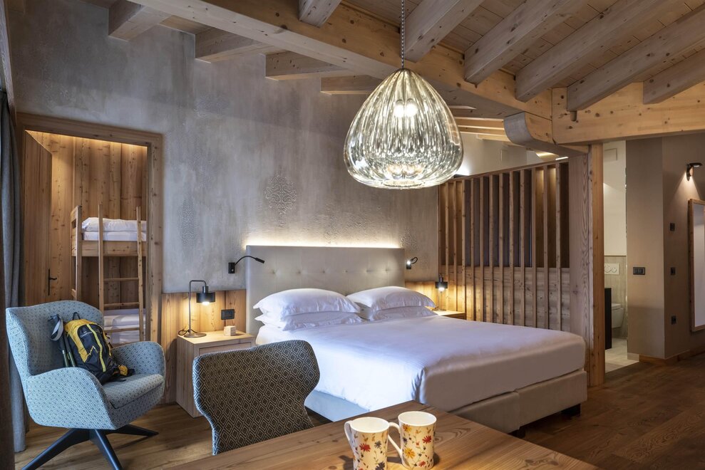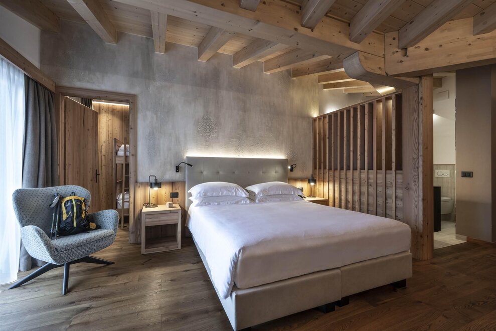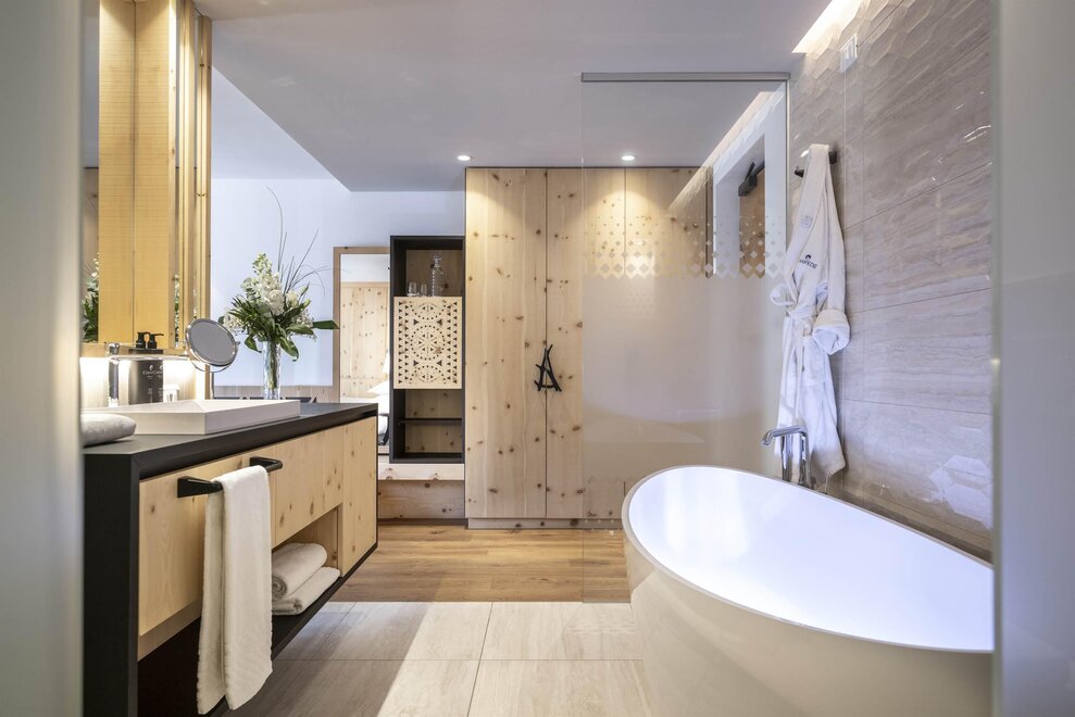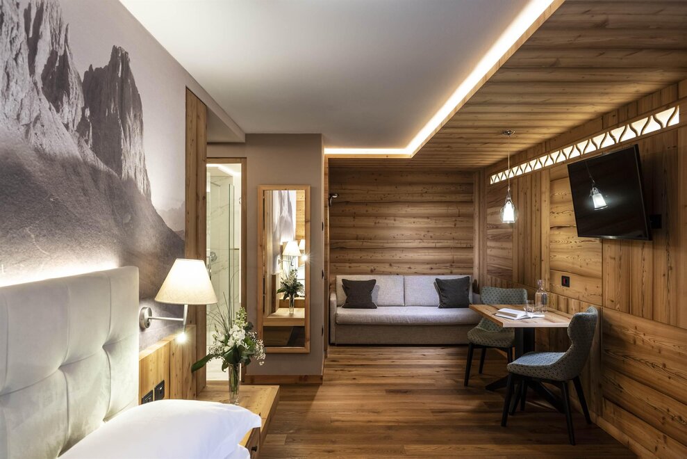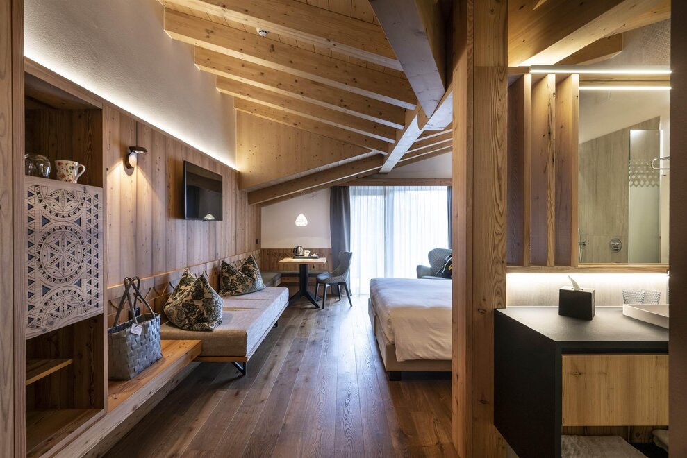 Junior suite in legno vecchio o in larice nordico con pavimento in legno, divano letto, LCD-TV, cassaforte, telefono, frigo bar, bollitore, Wi-Fi gratuito, balcone o terrazzo con vista mozzafiato sulle Dolomiti attrezzato con sedie reclinabili e tavolino. Bagno (aperto o chiuso) con ampia doccia, accappatoi e ciabattine, asciugacapelli, specchio cosmetico. Posto auto in garage riservato.