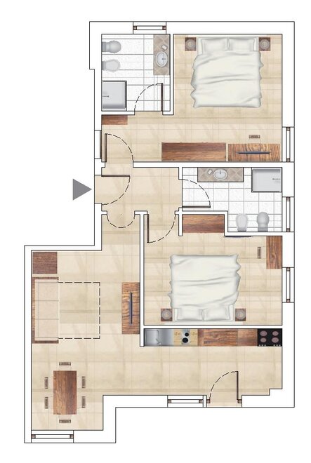 - Trilo Special: 2 camere doppie o matrimoniali, soggiorno/cucina e 2 bagni (disponibile solo presso la nuova dependance a 50 m dallla struttura principale)