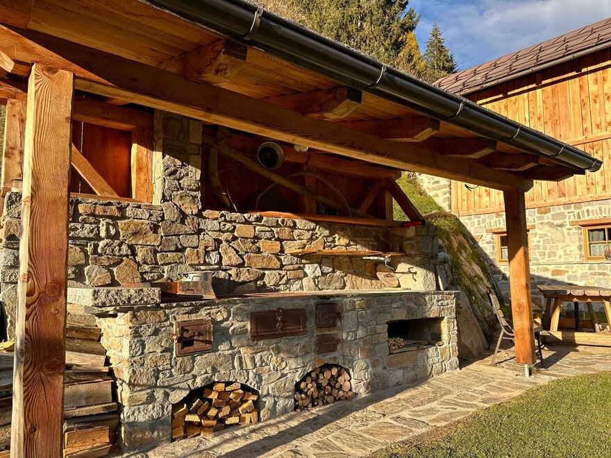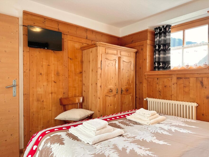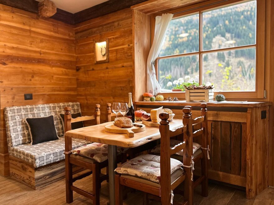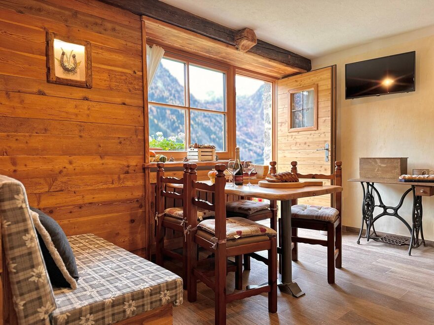 La casa si apre sull'area giorno con divanetti, tv e tavolo 5 posti, ma i veri protagonisti di questa area sono una grande stube a olle (una tipica stufa a legna tradizionale delle regioni alpine molto efficiente) che terrà la casa calda per tutto il giorno, e la vista spettacolare verso le montagne.