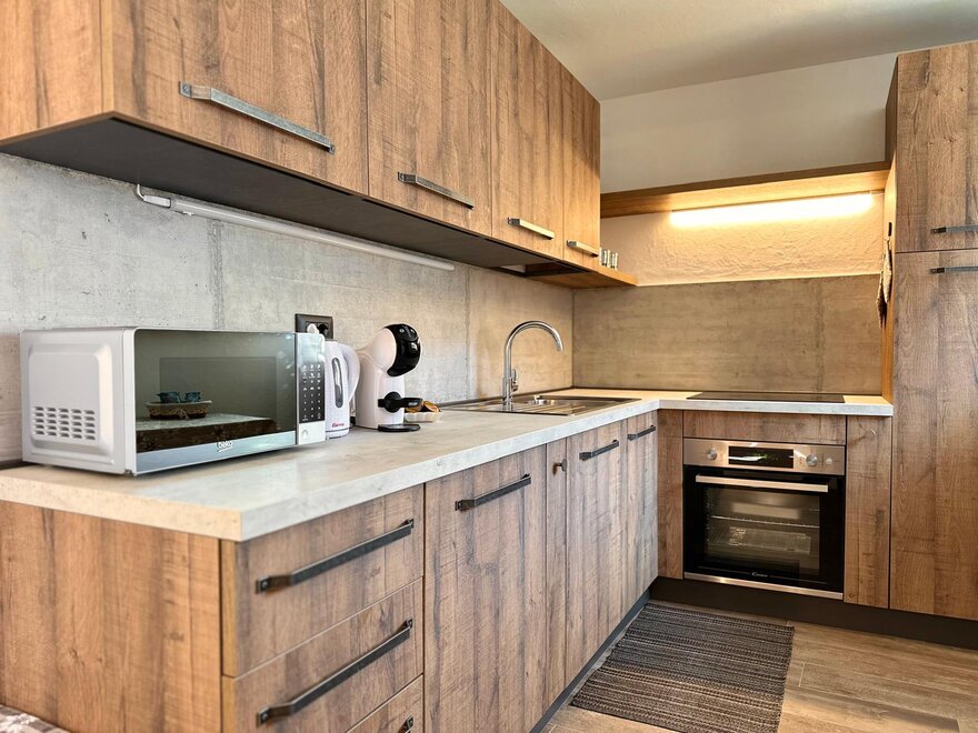 La cucina è moderna ed attrezzata con macchina del caffè Delonghi, bollitore elettrico, fornelli ad induzione, microonde, forno, frigorifero e lavastoviglie.