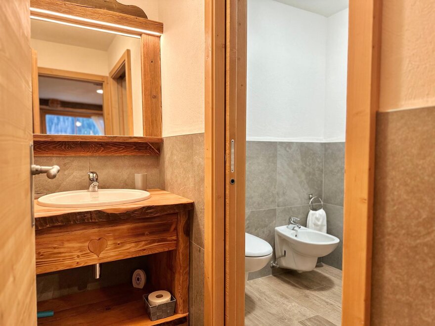 Il bagno è grande e suddiviso da un antibagno con lavandino e bagno con wc, bidet e comoda doccia riscaldata su una parete dalla stufa adiacente.dotazioni camere/appartamenti