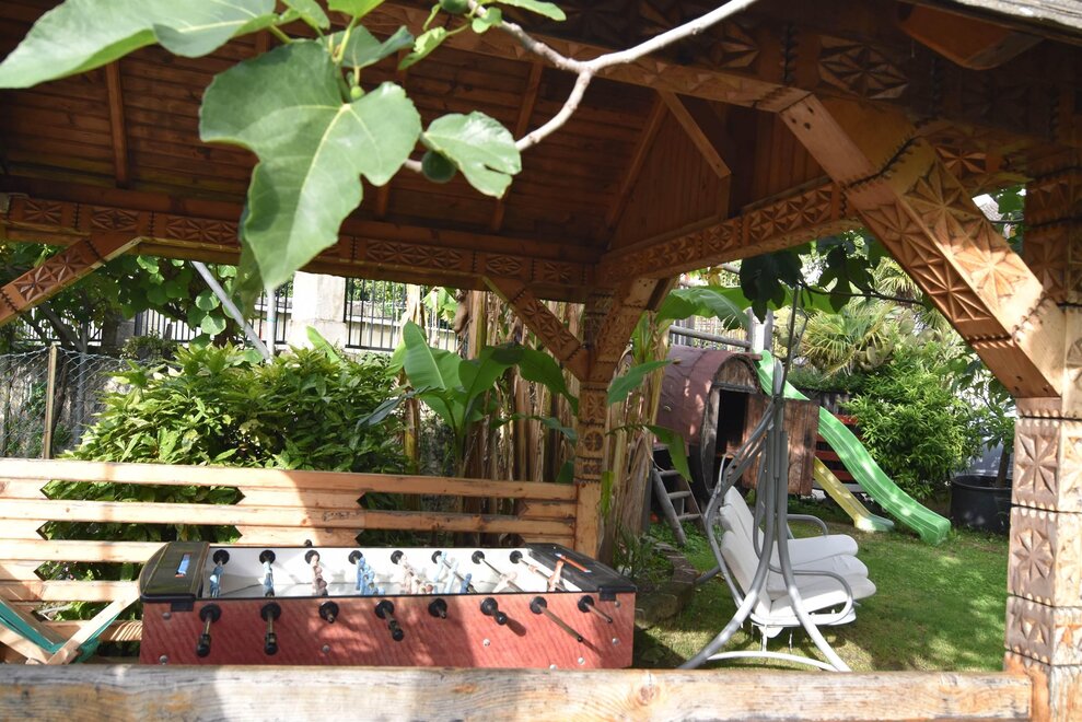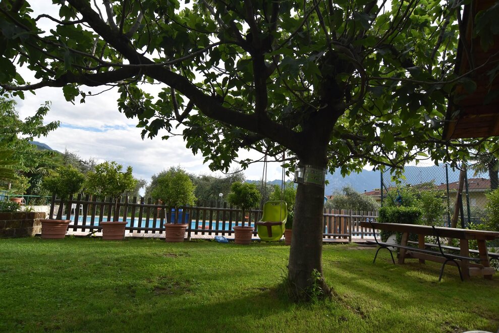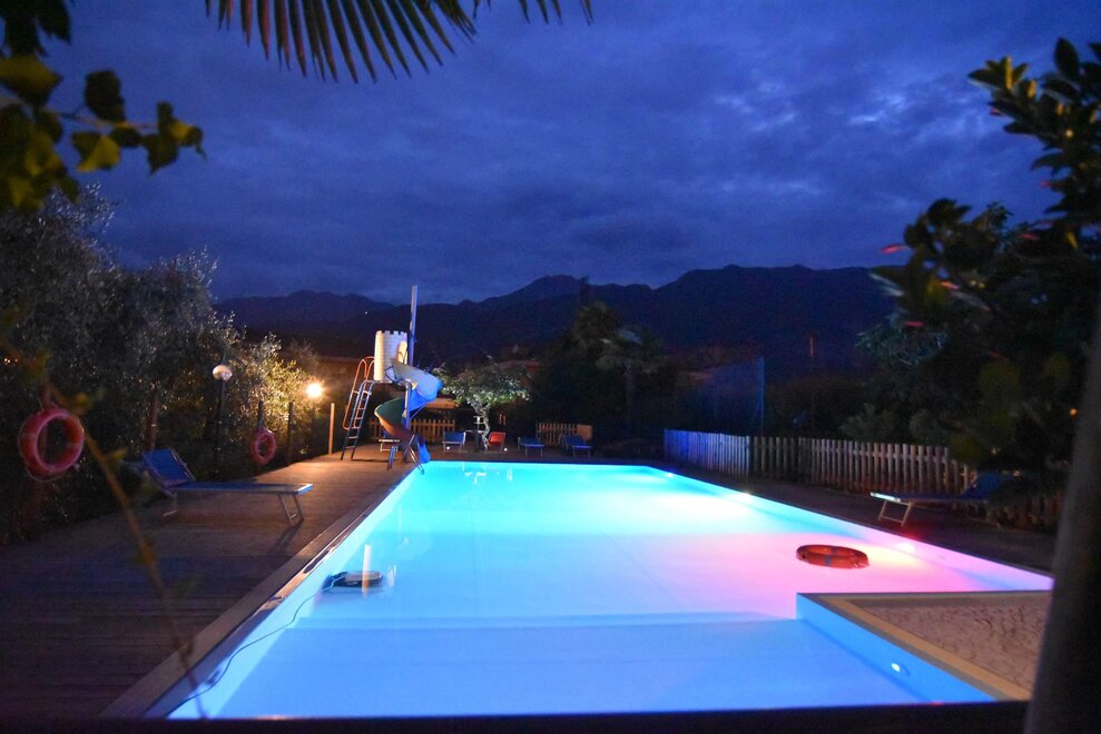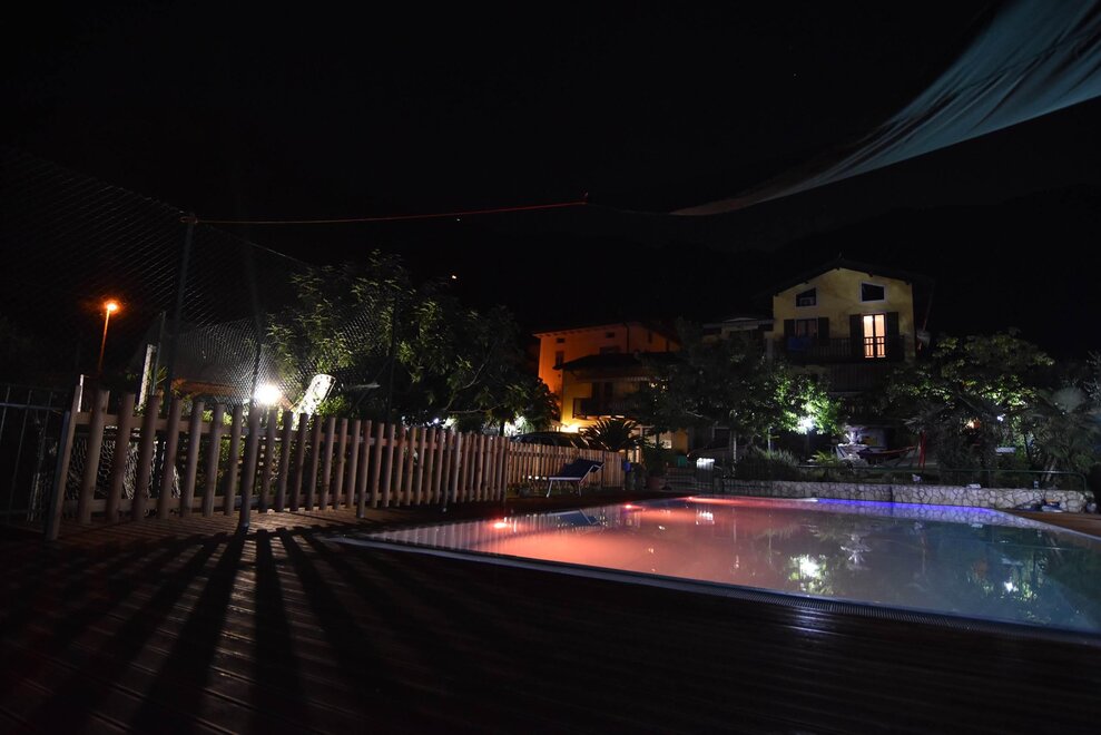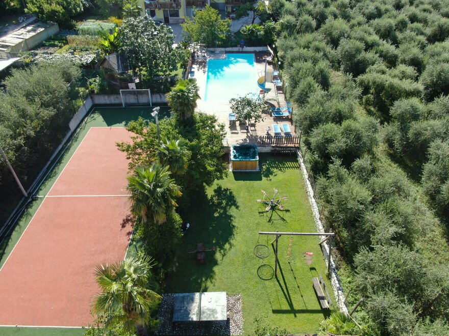 piscina con solarium, un bel giardino, campo da tennis, calcio, basket, volley, ping pong, calciobalilla e area grill con tavoli