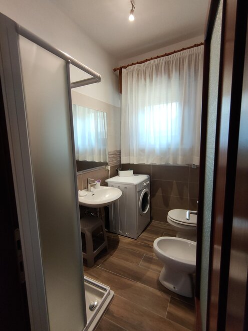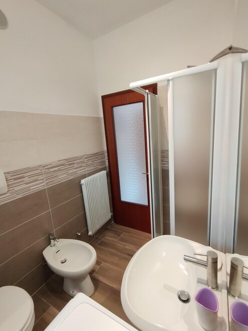 Appartamento per vacanze termali per famiglia al terzo piano di 50 mq costituito da soggiorno con angolo cottura dotato di forno a microonde, divano letto, corridoio, bagno e doccia dotata di phon, riscaldamento centrale, lavatrice, asse e ferro da stiro, aspirapolvere, televisore con antenna satellitare, seggiolone e lettino, biancheria da cucina, da camera e da bagno (a richiesta), terrazza, cortile con barbecue, posto macchina all’aperto riservato, ascensore, biciclette a disposizione, telefono in comune, si accettano animali di piccola taglia.