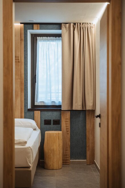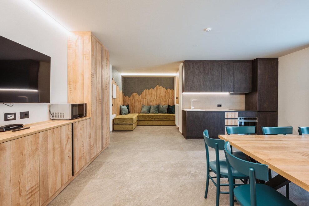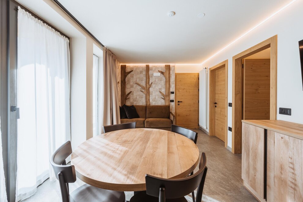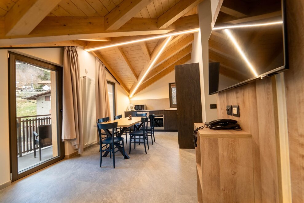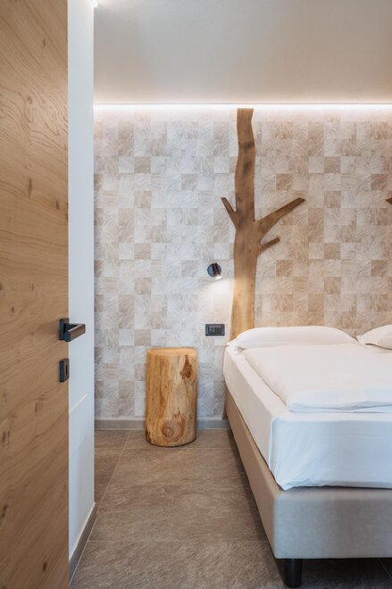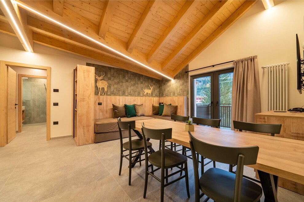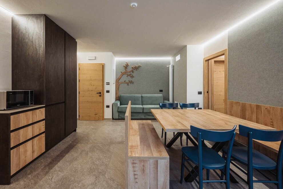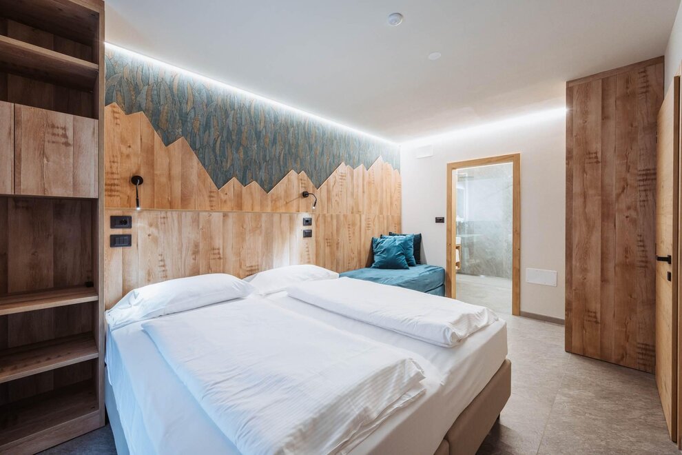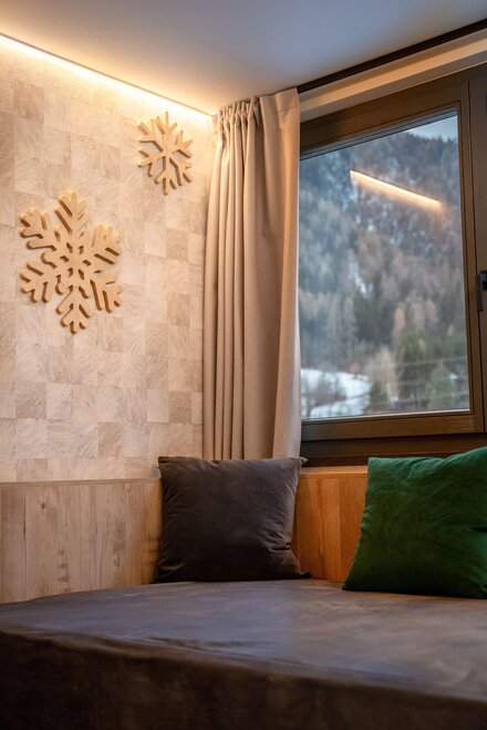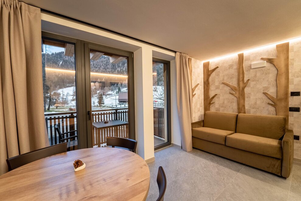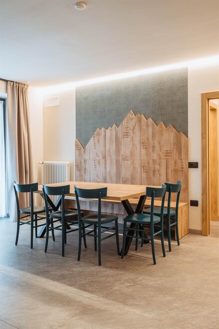 Gli ampi spazi sono caratterizzati da colori che si ispirano alla natura primordiale della Val di Sole e che fanno sentire un tutt’uno con l’ambiente circostante.