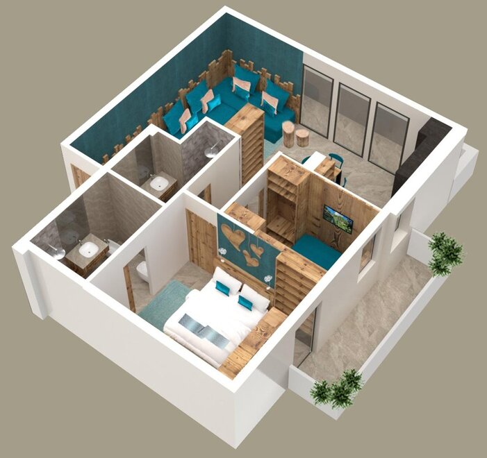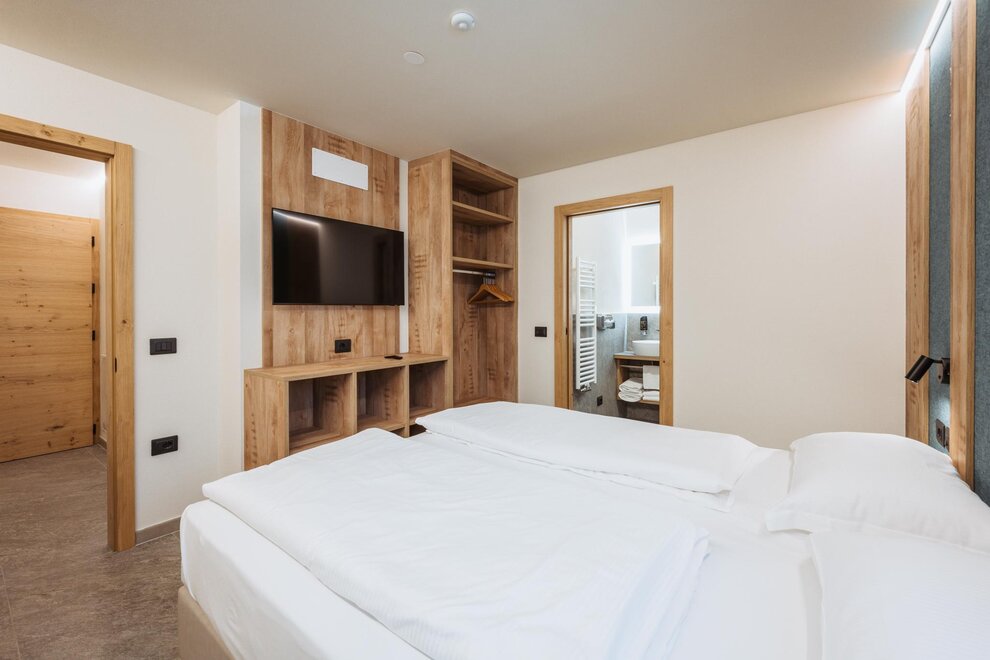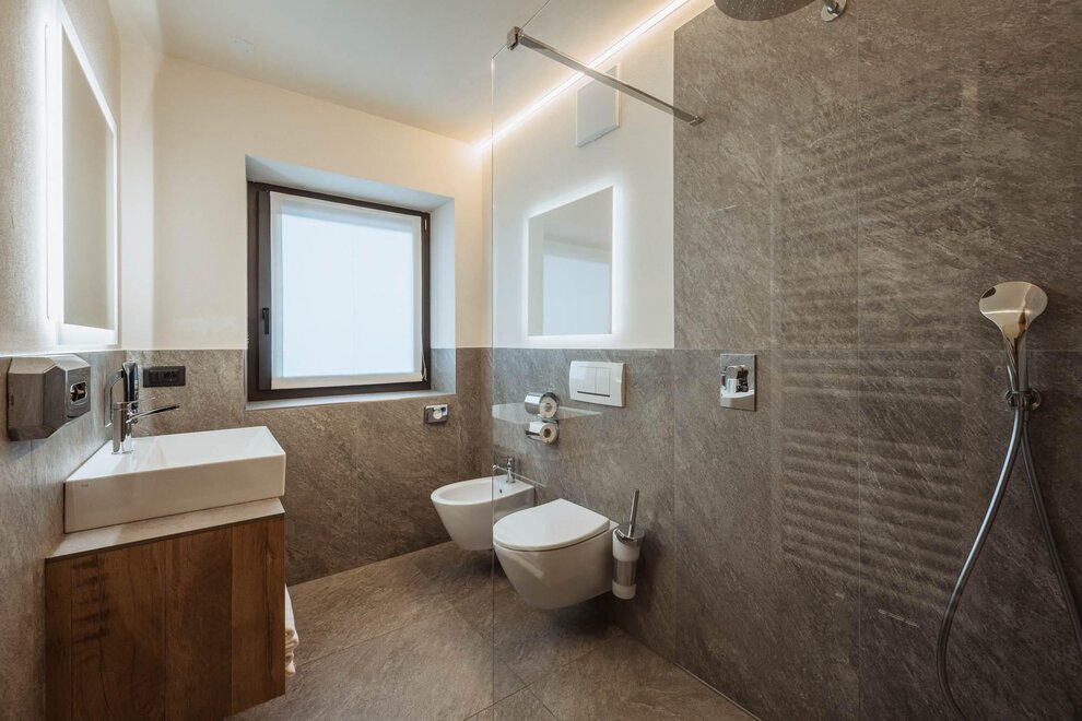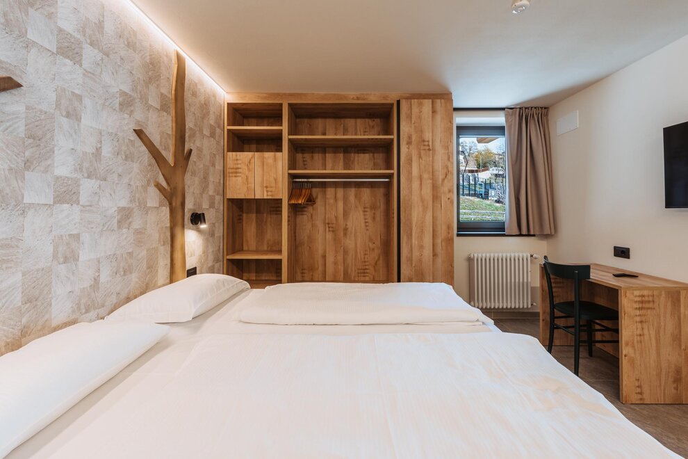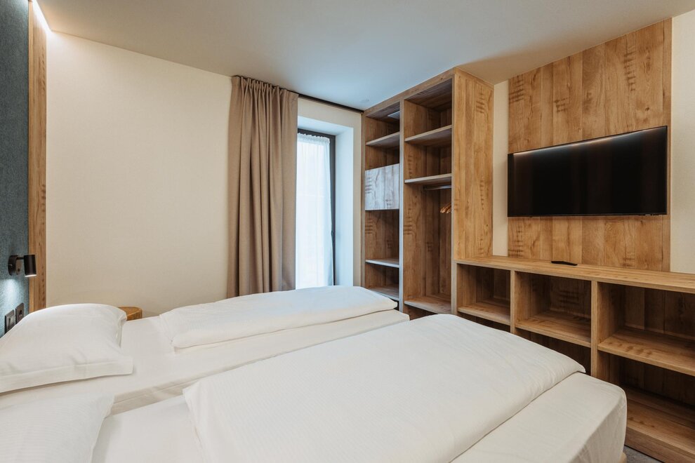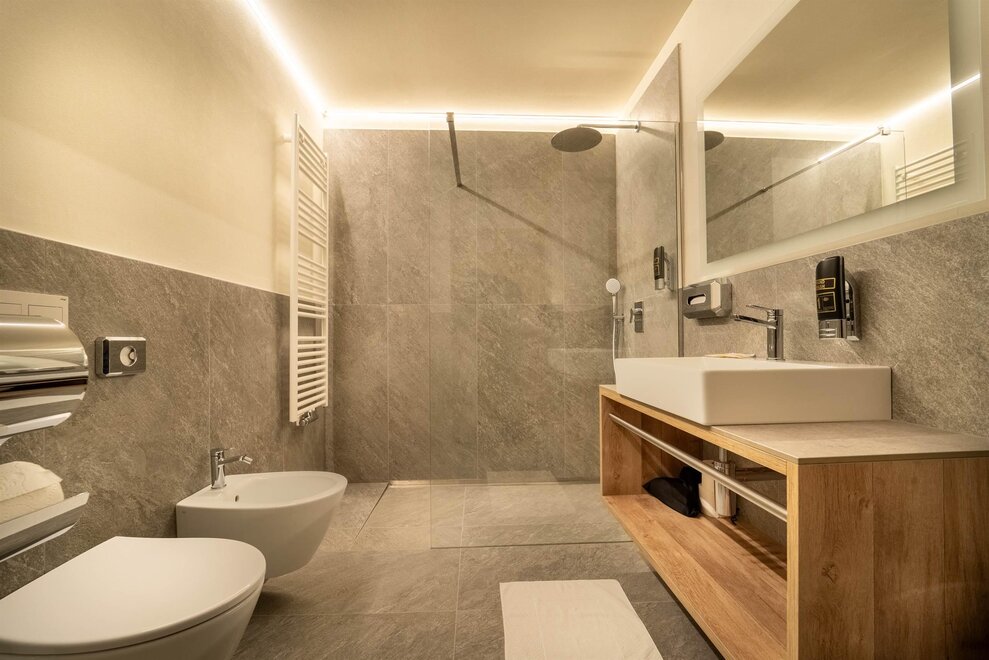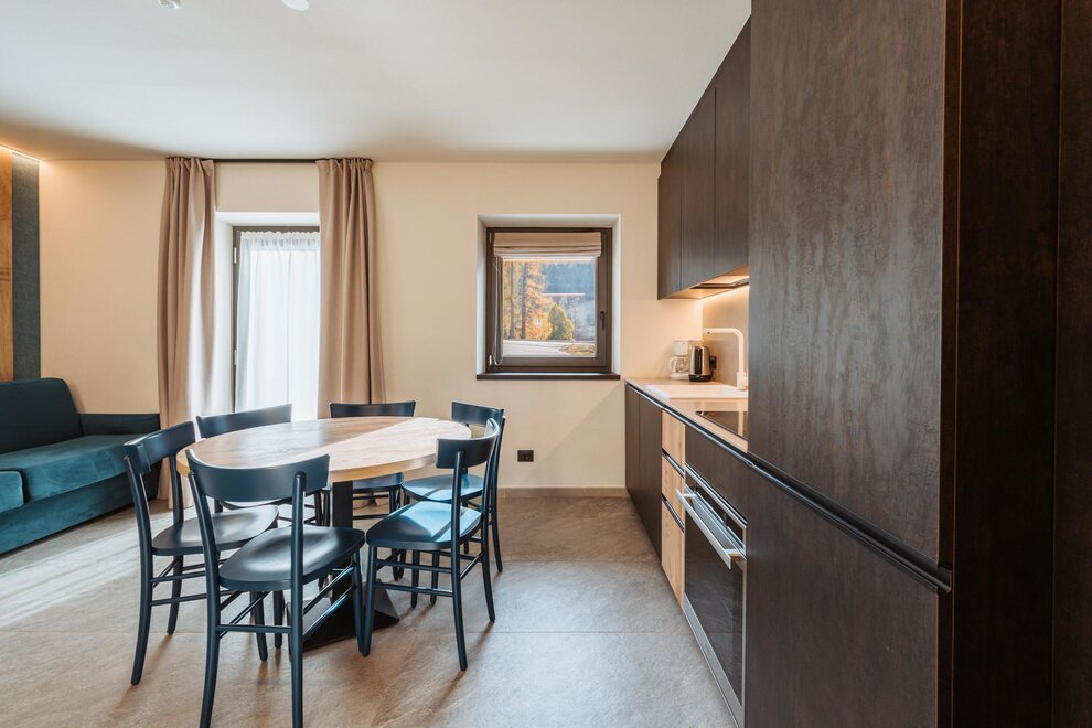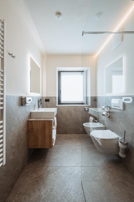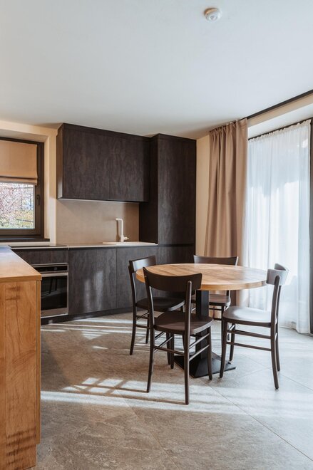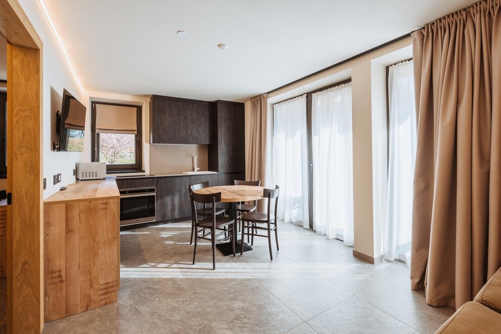 Gli ampi spazi sono caratterizzati da colori che si ispirano alla natura primordiale della Val di Sole e che fanno sentire un tutt’uno con l’ambiente circostante.