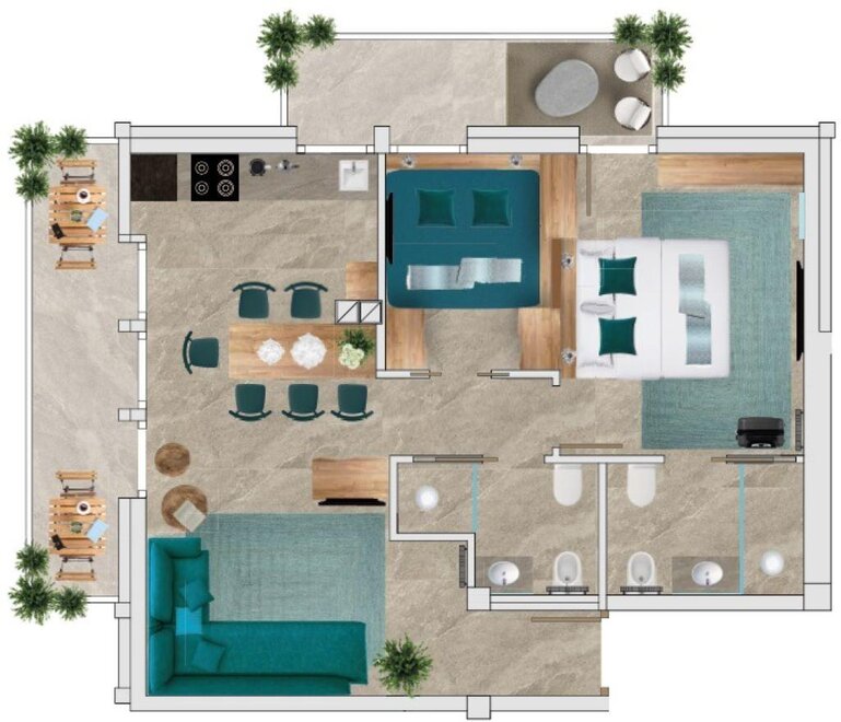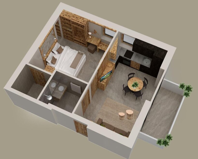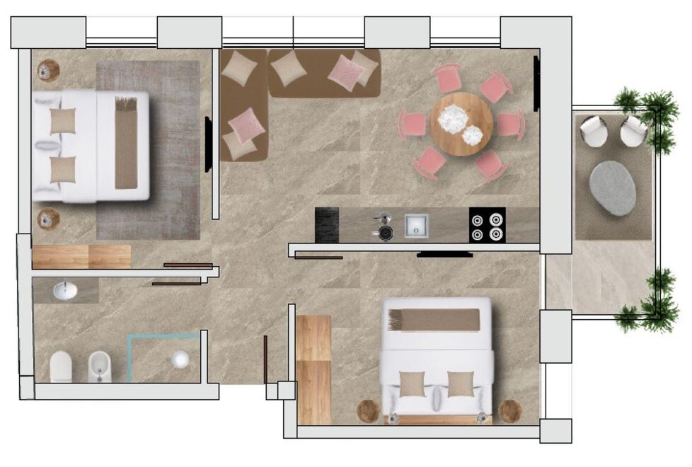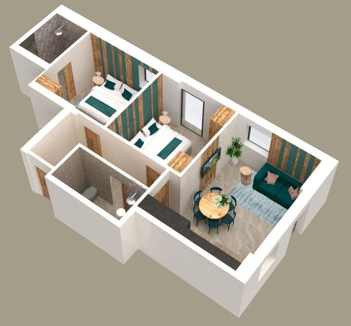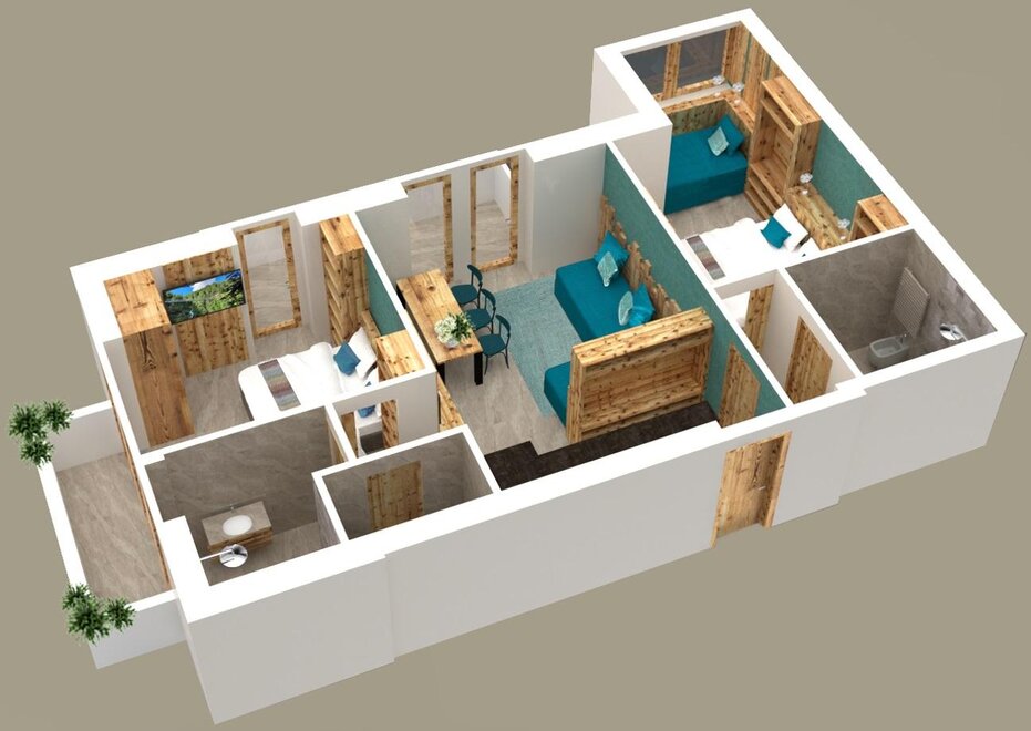 Confortevole trilocale di 54 m² per 4-6 persone dotato di 1 camera matrimoniale, 1 camera matrimoniale con bagno, 1 bagno, cucina e soggiorno con divano letto per 2 persone, terrazzo non delimitato.