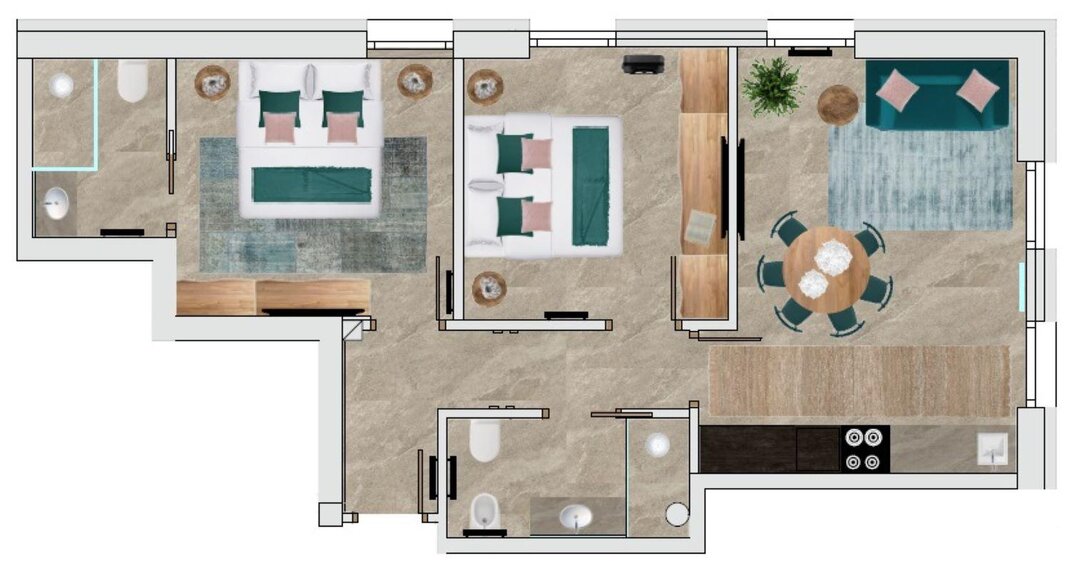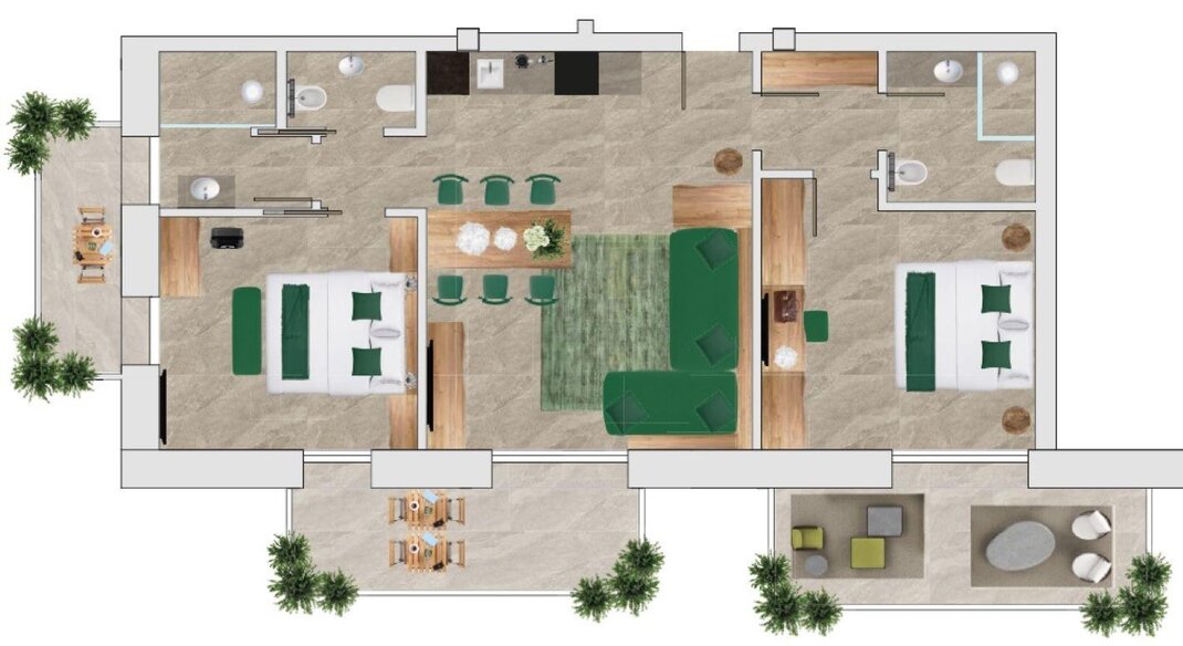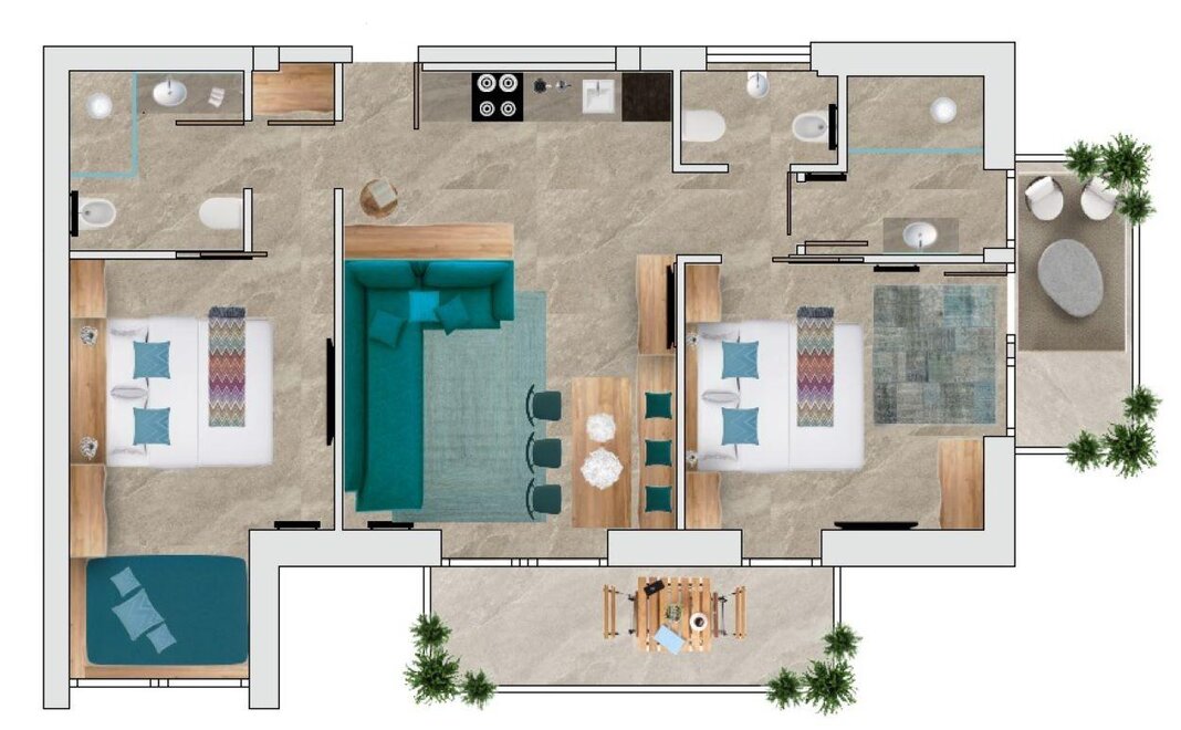 Confortevole trilocale di 65 m² per 4-6 persone dotato di 2 camere matrimoniali, 2 bagni, cucina e soggiorno con divano letto per 2 persone, balcone