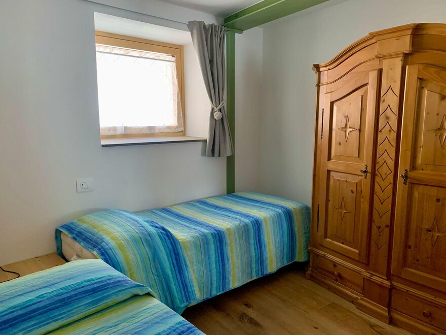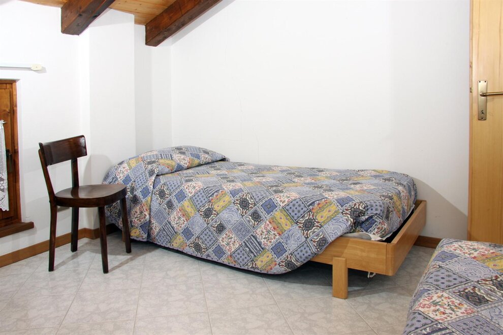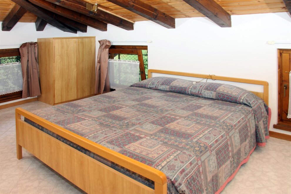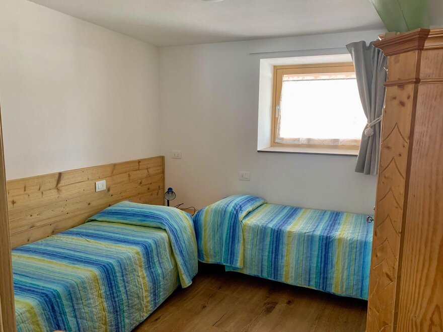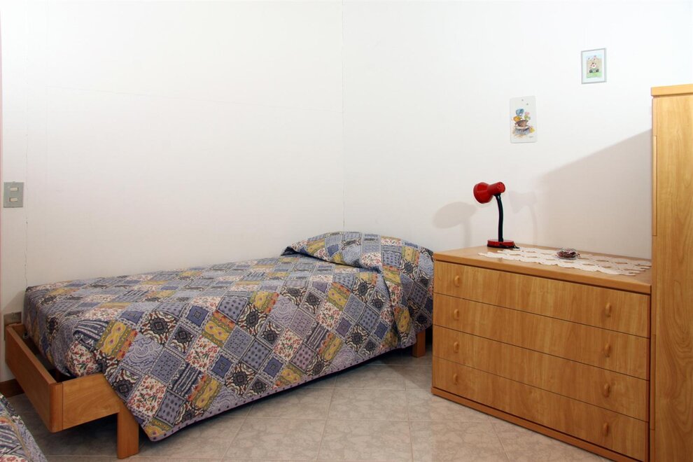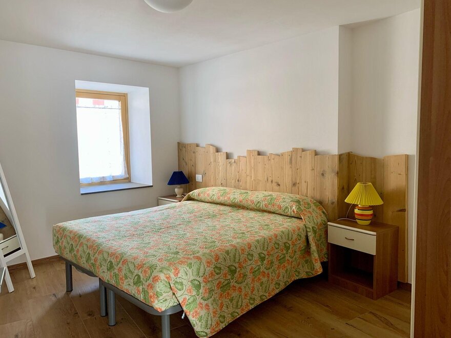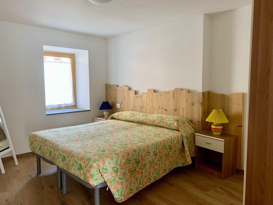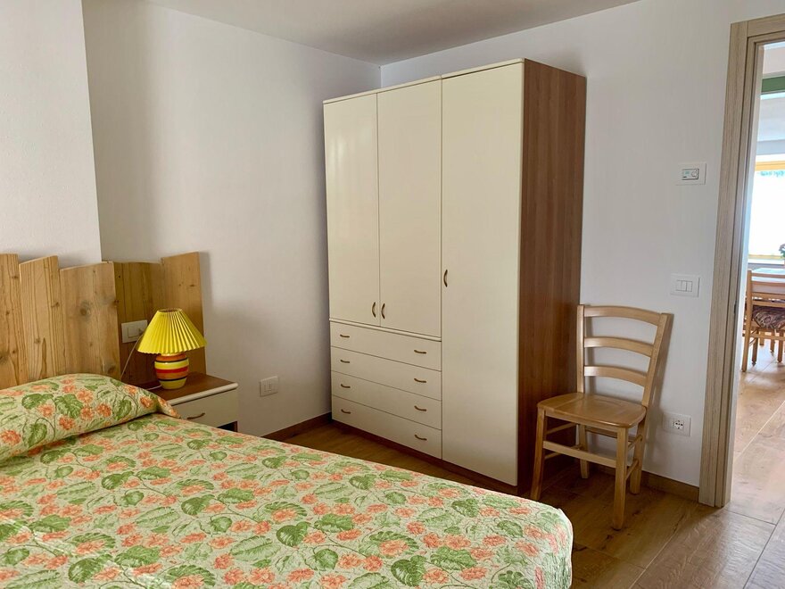 Appartamento mansardato situato al secondo piano, composto da una camera da letto matrimoniale, una camera con due lettini singoli, un bagno con doccia e lavatrice e una cucina soggiorno con divano letto matrimoniale, forno e frigo con cella frigorifera.