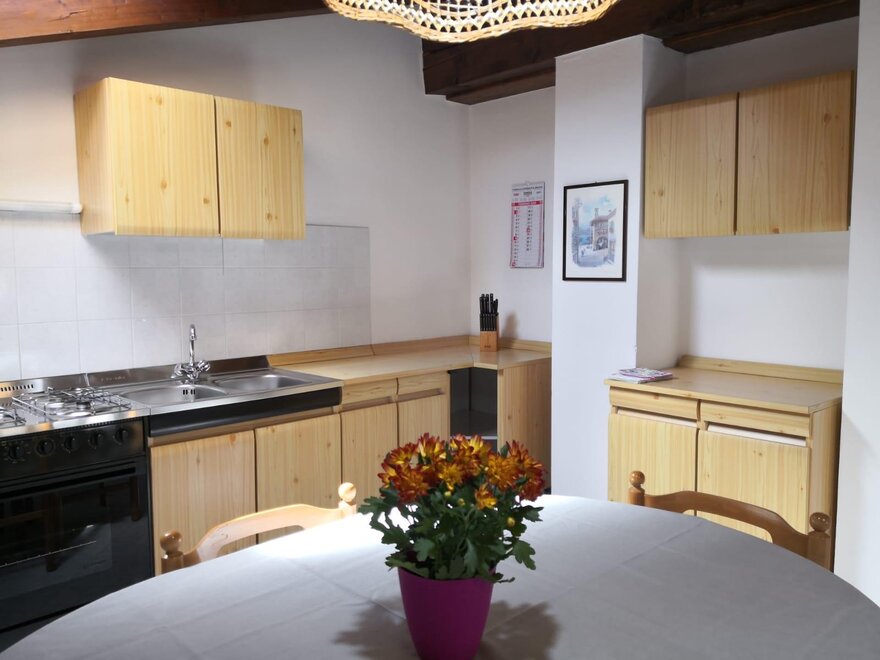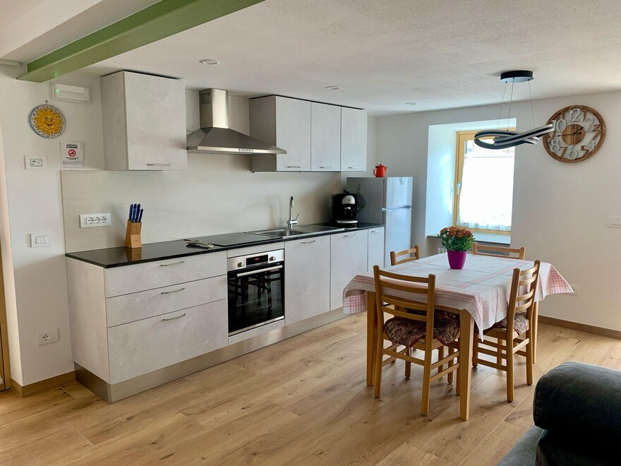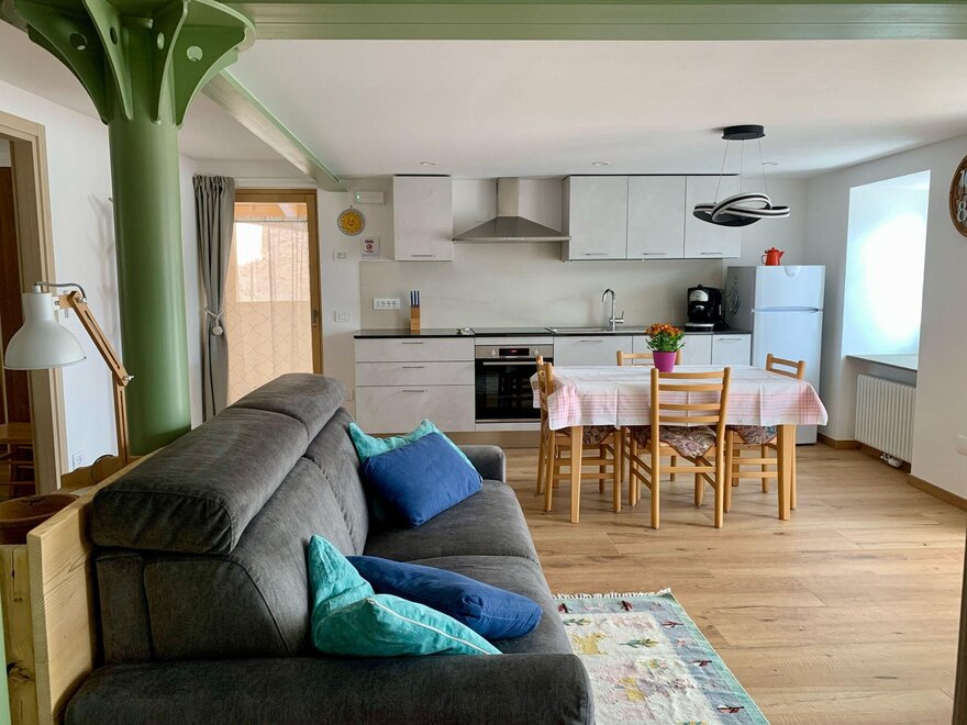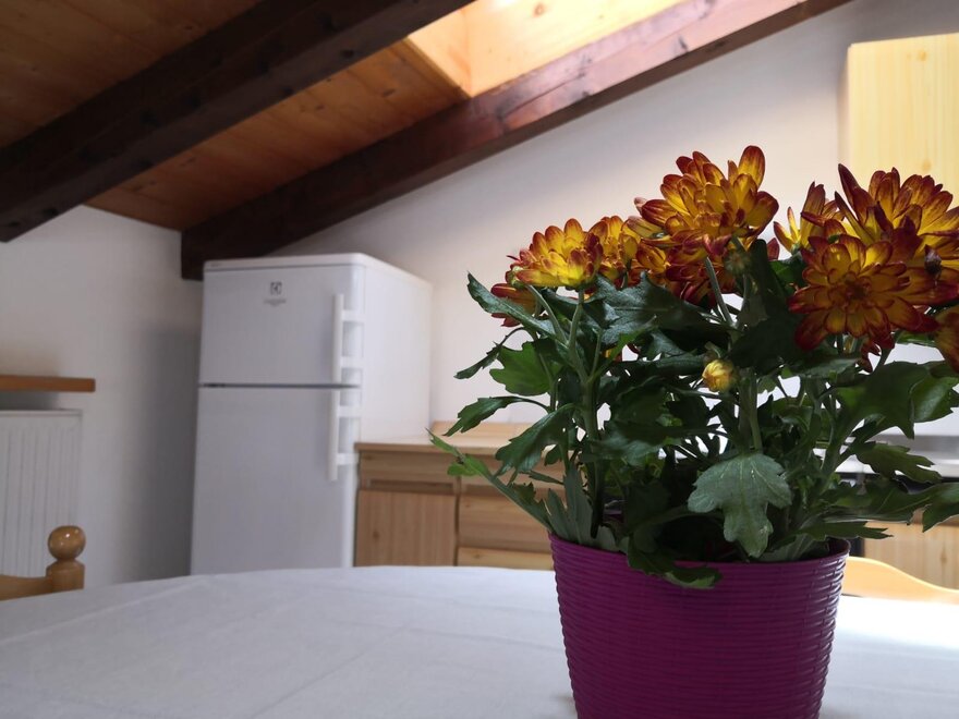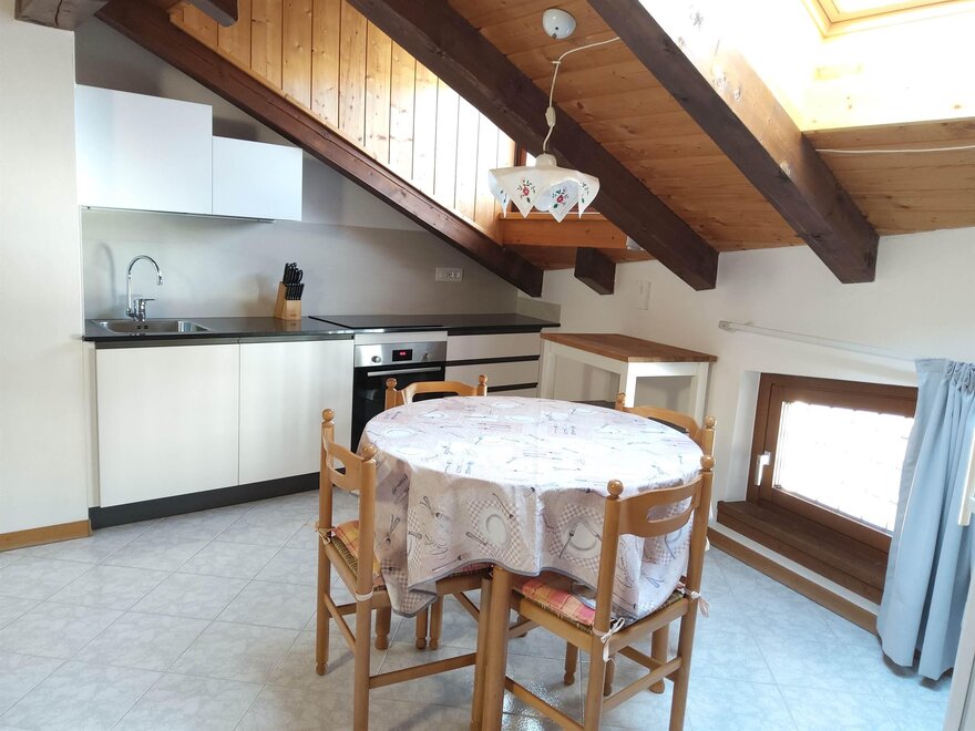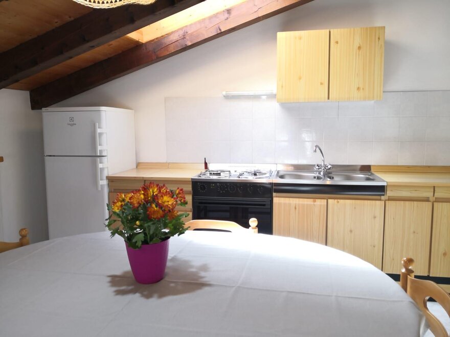 Appartamento mansardato situato al secondo piano, composto da una camera matrimoniale, un bagno con doccia e lavatrice e una cucina con forno, frigorifero con congelatore, lavastoviglie e angolo cottura ad induzione. L'appartamento può ospitare 2-4 persone. Riscaldamento centralizzato.