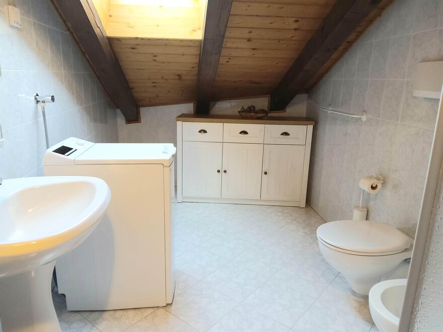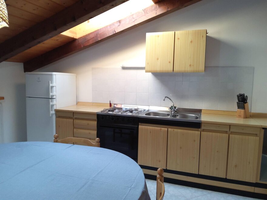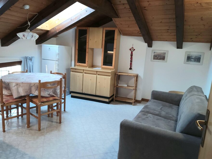 Appartamento mansardato situato al secondo piano, composto da una stanza da letto matrimoniale, un bagno con doccia e lavatrice e una cucina soggiorno con divano letto matrimoniale, forno, frigo con cella freezer, lavastoviglie e piano cottura ad induzione.