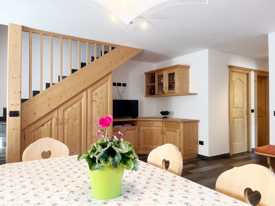 La casa dispone di lavanderia, deposito sci con scaldascarponi e posto auto in parcheggio privato.