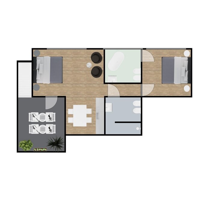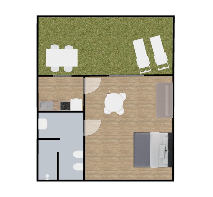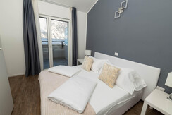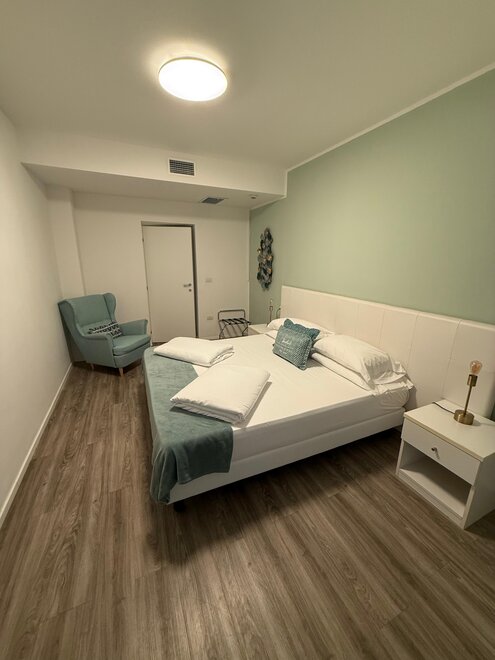 Appartamento bilocale di 45/50 metri quadrati con terrazza privata, adatto per 2-5 persone. Camera doppia, soggiorno con 3 posti letto e cucina attrezzata con frigorifero e piastre elettriche. Bagno con doccia e asciugacapelli.