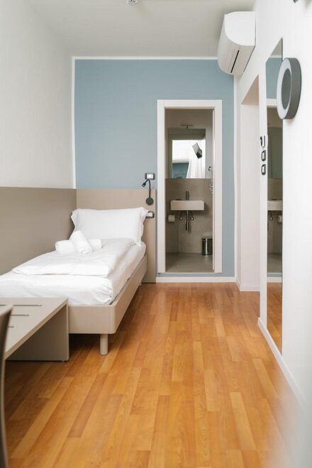 Perfetta per chi è in cerca di tranquillità o per chi si muove per lavoro, tutto il necessario per sentirsi a proprio agio: letto singolo, aria condizionata autonoma, scrivania, bagno privato rinnovato con doccia, Wi-Fi gratuito e TV a schermo piatto. Il balcone con tavolino è ideale per concedersi un momento all’aria aperta.