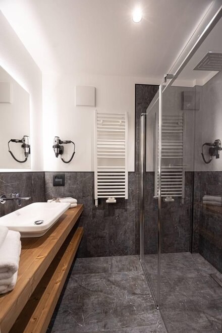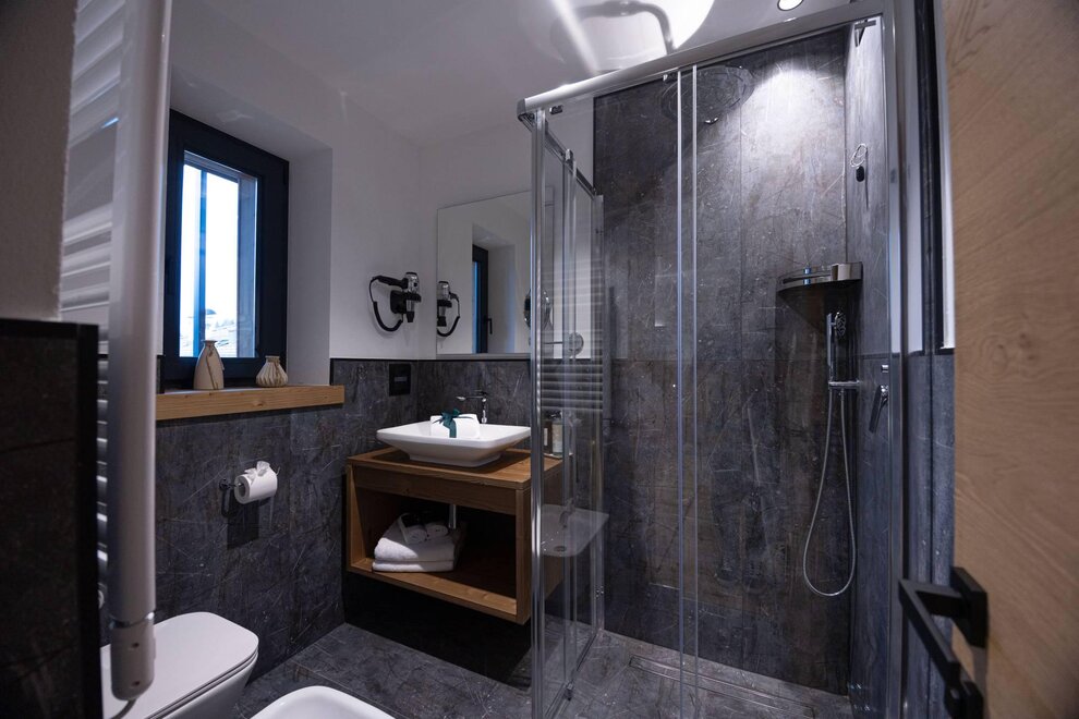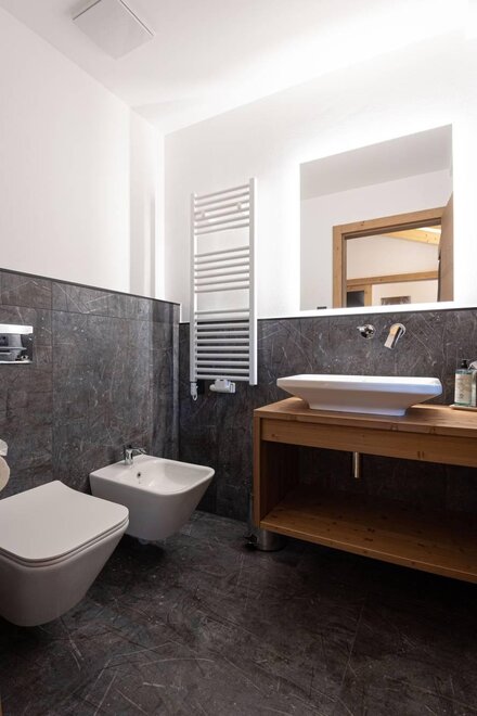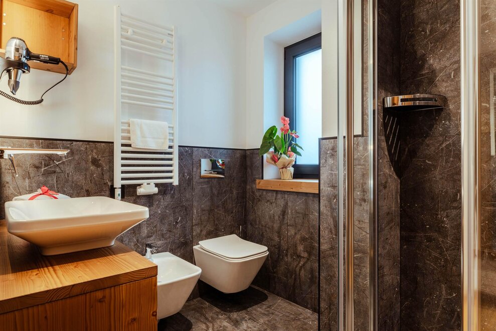 Alcune dispongono di bagni divisi: da una parte WC, bidet e lavandino, dall'altra doccia (alcune "a vista") e lavandino.