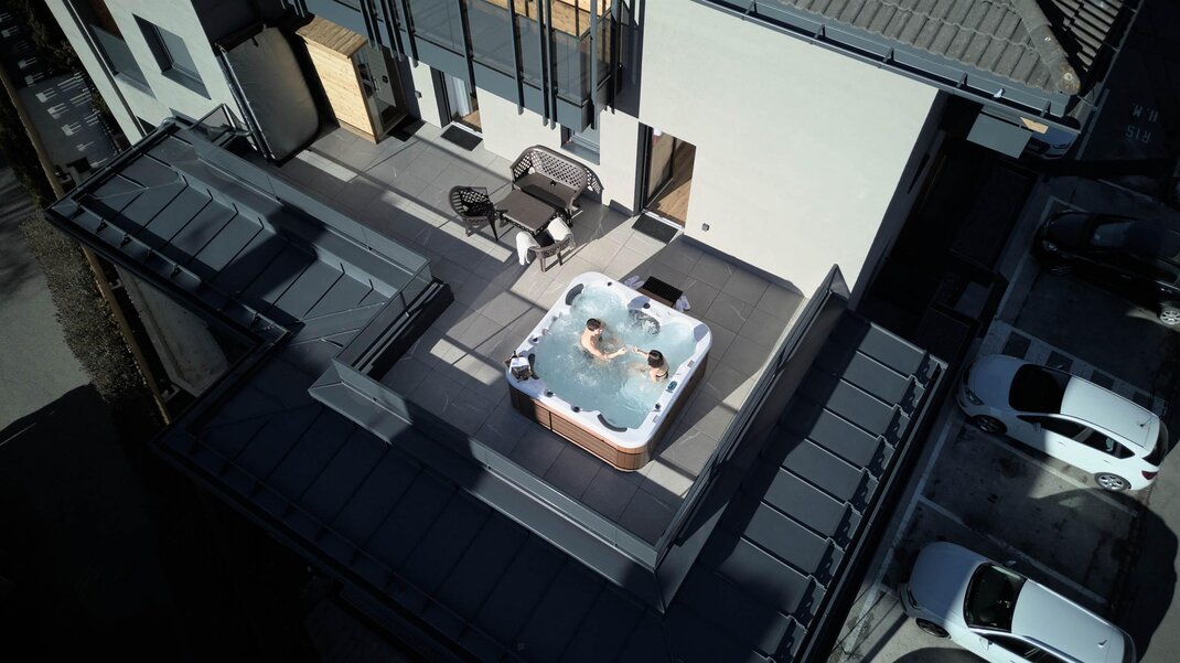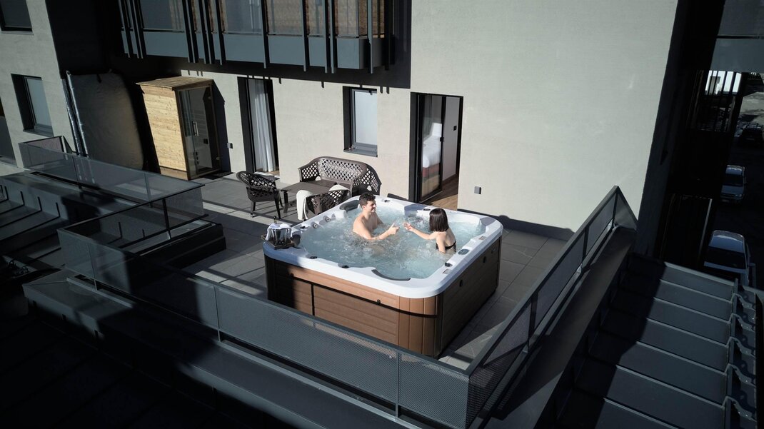 E' inoltre dotata di un'ampia terrazza privata, di 50 m², attrezzata con idromassaggio e sauna totalmente privati.