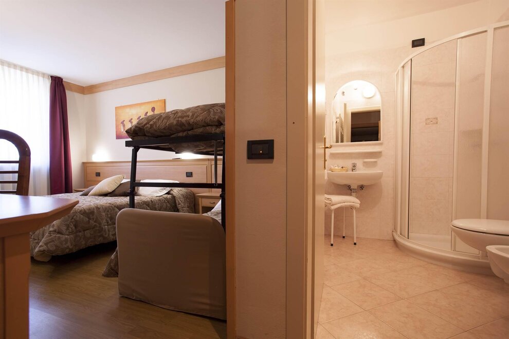 Stanza di 18-20 mq circa con balcone, arredo moderno bicolore - rovere sbiancato e wengè, richiamo alla tradizione montana. Situata al quarto piano gode di servizi principali quali phon, telefono, TV LCD digitale, cassaforte, free wi-fi, servizio in camera su richiesta e balcone disponibile anche sulla via principale di Folgaria. Letto matrimoniale o 2 letti singoli + lettino/culla. Bagno privato con doccia, bidet e lavandino (4 mq circa extra metratura stanza). Una stanza non dispone di balcone bensì di finestra più ampia. Per la cena proponiamo cucina casalinga con scelta tra 4 primi, 4 secondi, buffet di verdure e vetrina dei dolci fatti in casa.