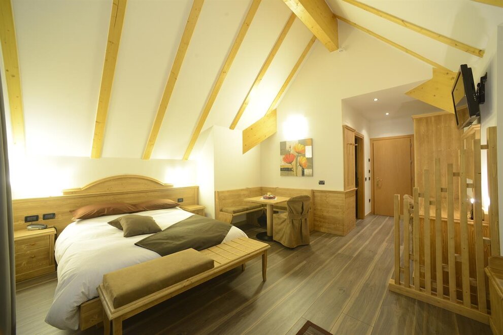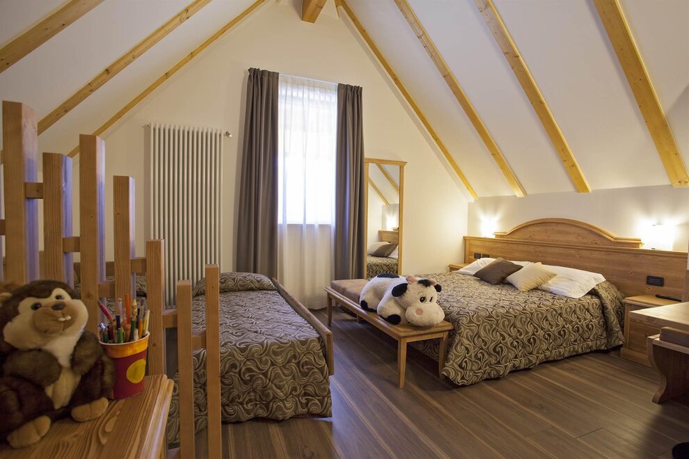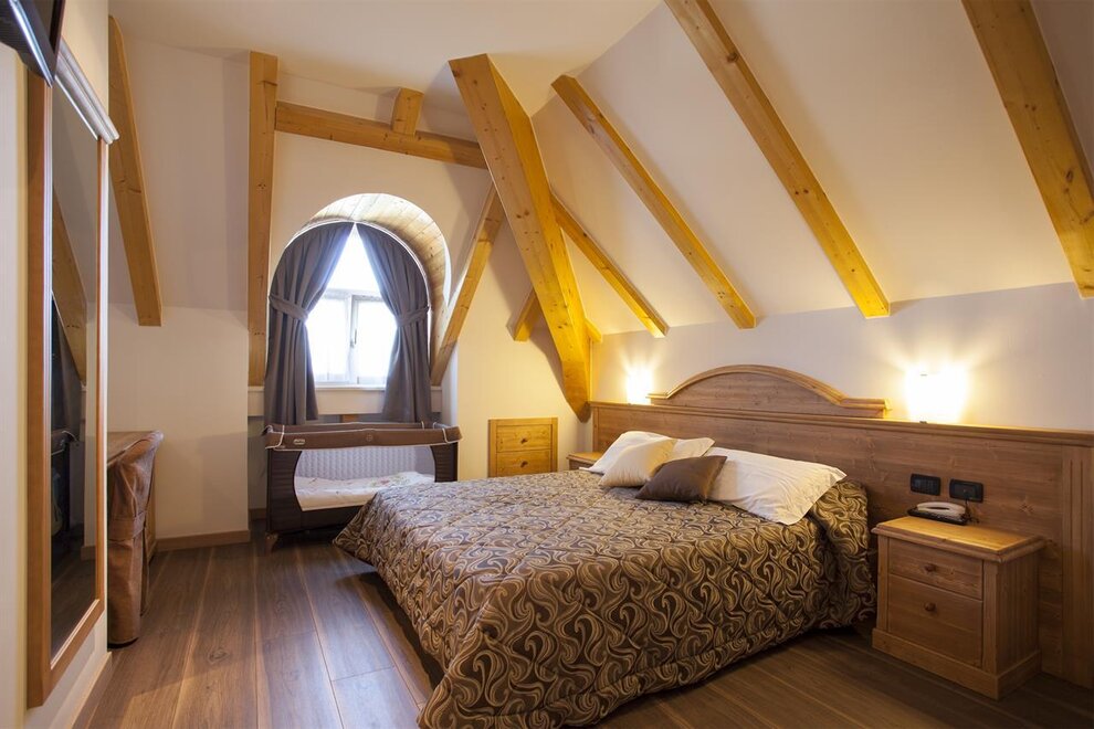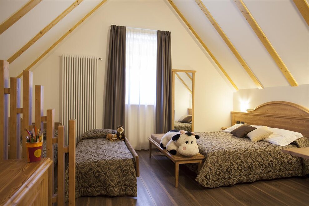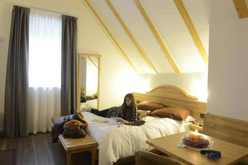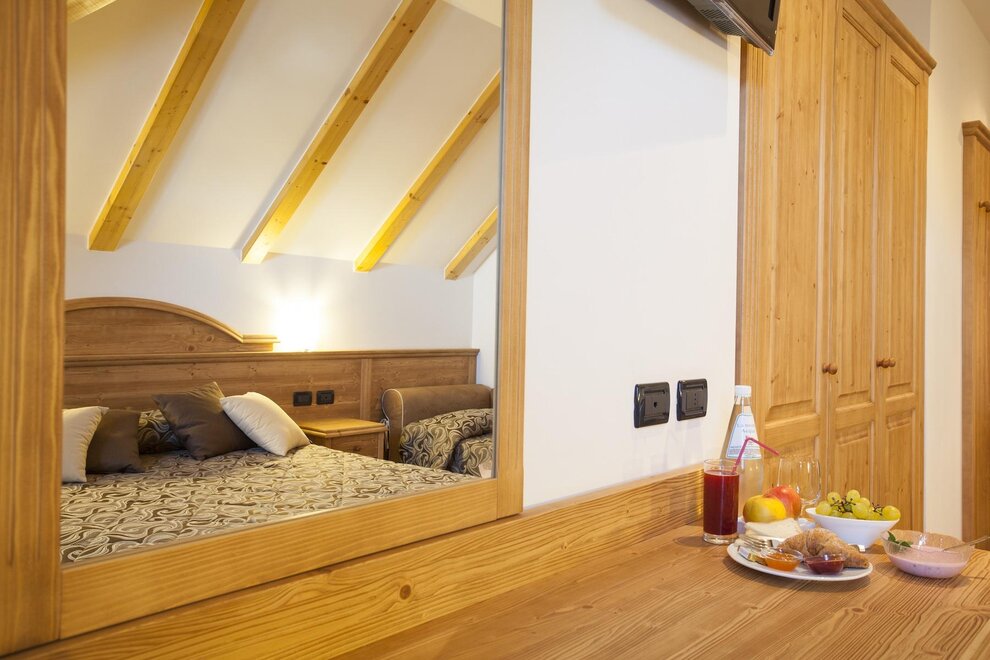 Stanza di 25 mq ispirata al bosco di Folgaria. Arredata in legno d'abete, risulta armoniosa, spaziosa e ben curata nei dettagli. Situata al quinto piano gode di servizi quali phon, telefono, TV LCD digitale, cassaforte, free wi-fi, servizio in camera su richiesta e morbito accappatoio con ciabattine. Letto matrimoniale + 2 letti singoli. Bagno privato con doccia, bidet e lavandino (5 mq circa extra metratura stanza).