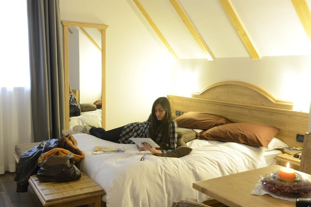 Stanza di 18-20 mq circa con balcone, arredo moderno bicolore - rovere sbiancato e wengè, richiamo alla tradizione montana. Situata al quarto piano gode di servizi principali quali phon, telefono, TV LCD digitale, cassaforte, free wi-fi, servizio in camera su richiesta e balcone disponibile anche sulla via principale di Folgaria. Letto matrimoniale o 2 letti singoli + lettino/culla. Bagno privato con doccia, bidet e lavandino (4 mq circa extra metratura stanza). Una stanza non dispone di balcone bensì di finestra più ampia. Colazione locale e internazionale a buffet e bevande calde servite.