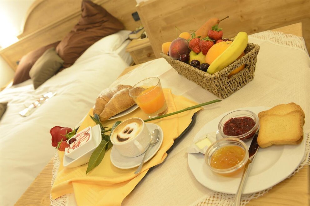 Stanza di 14-15 mq circa con balcone, arredo moderno bicolore - rovere sbiancato e wengè, richiamo alla tradizione montana. Situata al quarto piano gode di servizi principali quali phon, telefono, TV LCD digitale, cassaforte, free wi-fi, servizio in camera su richiesta e balcone disponibile anche sulla via principale di Folgaria. Letto matrimoniale o 2 letti singoli. Bagno privato con doccia, bidet e lavandino (4 mq circa extra metratura stanza). Una stanza non dispone di balcone bensì di finestra più ampia. Per la cena proponiamo cucina casalinga con scelta tra 4 primi, 4 secondi, buffet di verdure e vetrina dei dolci fatti in casa.