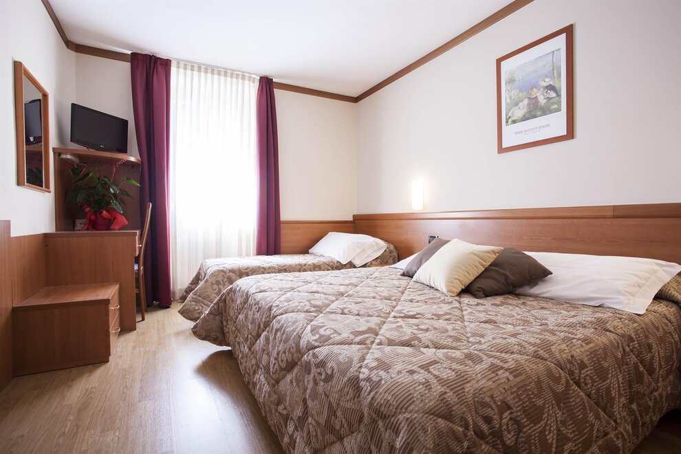 Stanza di 13-15 mq circa completamente arredata in stile tradizionale con legno di ciliegio. Situata nei primi piani dell'hotel, gode di servizi principali quali phon, telefono, TV LCD digitale, cassaforte, free wi-fi. Bagno privato con doccia, bidet e lavandino (3-4 mq circa extra metratura stanza). Alcune sono completamente "senza barriere" con bagno dotato di doccia accessibile e maniglioni a norma CEE. Facilmente raggiungibili con ascensore. Pranzo e cena inclusi nell'offerta: cucina casalinga con scelta tra 4 primi, 4 secondi, buffet di verdure e vetrina dei dolci fatti in casa.