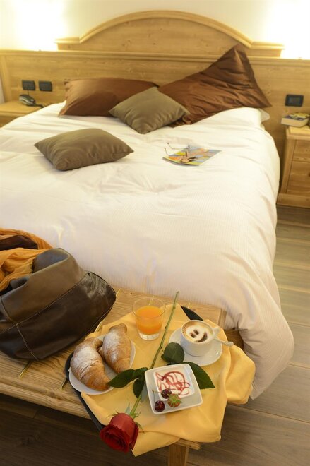 Stanza di 20 mq ispirata al bosco di Folgaria. Arredata in legno d'abete, risulta armoniosa, spaziosa e ben curata nei dettagli. Situata al quinto piano gode di servizi quali phon, telefono, TV LCD digitale, cassaforte, free wi-fi, servizio in camera su richiesta e morbito accappatoio con ciabattine. Letto matrimoniale. Bagno privato con doccia, bidet e lavandino (4 mq circa extra metratura stanza). Il ristorante propone per pranzo e cena una cucina casalinga con scelta tra 4 primi, 4 secondi, buffet di verdure e vetrina dei dolci fatti in casa.