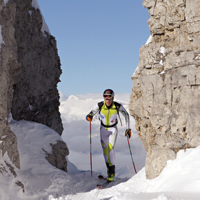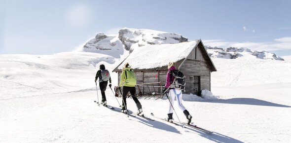 Dopo la salita con le pelli, scivolare nella neve fresca circondati dalle Dolomiti