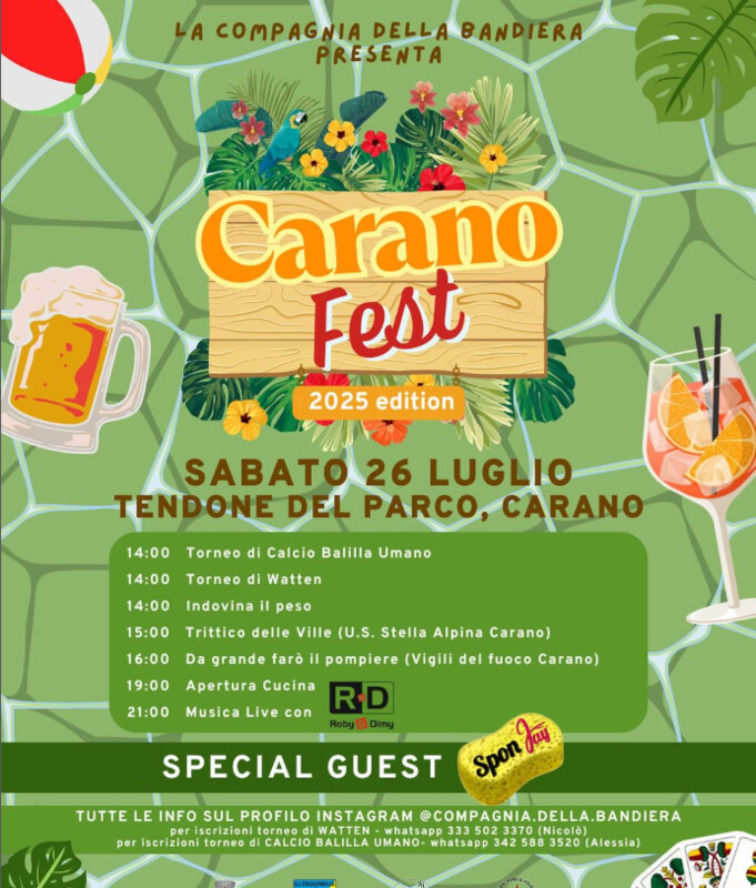 La Carano Fest parte in quarta con il torneo di Watten e con il Calcio Balilla Umano (prenotazioni rispettivamente al numero 3335023370 e 3425883520); i bambini possono giocare sui gonfiabili e partecipare ai giochi dei Pompieri a partire dalle 16.00.