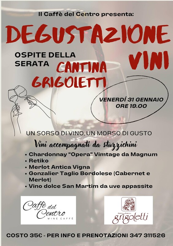 Il Caffè del Centro presenta una degustazione di vini della Cantina Grigoletti. I vini verranno accompagnati da stuzzichini.