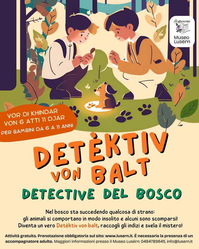 Detèktiv von Balt. Detective del Bosco. Nel bosco sta succedendo qualcosa di strano: gli animali si comportano in modo insolito e alcuni sono scomparsi! Diventa un vero Detèktiv von balt, raccogli gli indizi e svela il mistero! Attività gratuita con prenotazione obbligatoria, per bambini da 6 a 11 anni. Ore: 10:30 Luogo: Museo Lusérn Info: presso Museo Lusérn 0464789645 o info@lusern.it