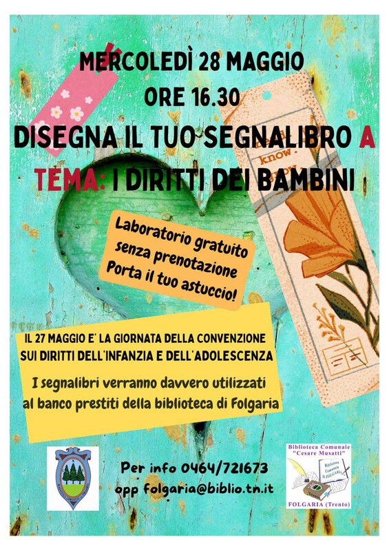 Disegna il tuo segnalibro a tema: i diritti dei bambini! Laboratorio gratuito senza prenotazione. Ore: 16:30 Luogo: Biblioteca Comunale di Folgaria Info: 0464721673 oppure folgaria@biblio.tn.it