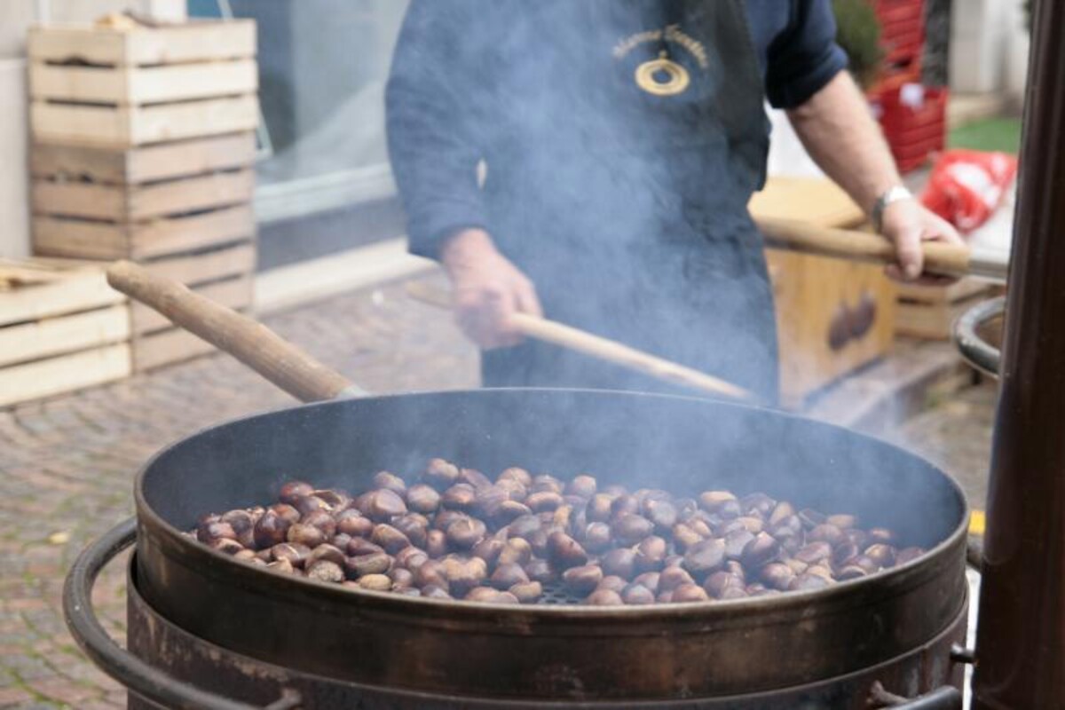 Castagne, vin brulé, tè alla menta, zucchero filato, strauben e dolcetti per Halloween in Piazza Granda.