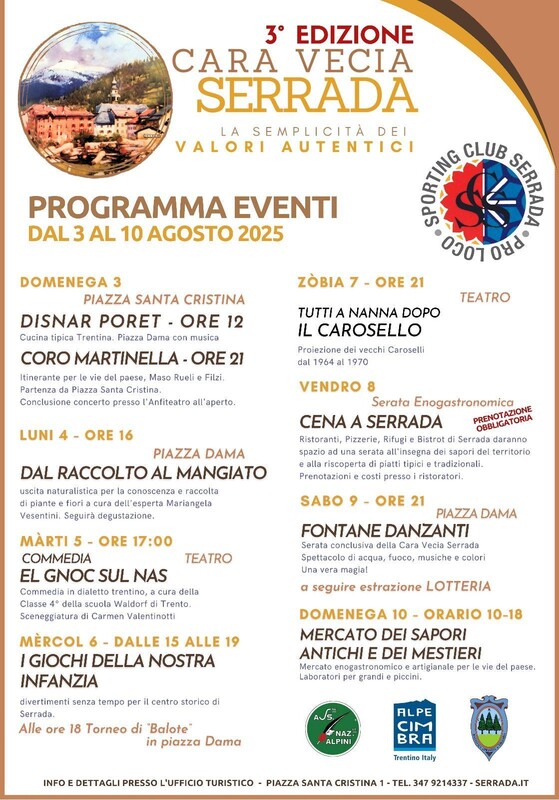 Info: presso l'Ufficio Informazioni in Piazza Santa Cristina 1, Serrada, oppure al 3479214337