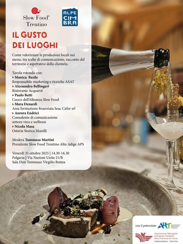 Un incontro per approfondire come valorizzare le produzioni locali nei menu, tra scelte di comunicazione, racconto del territorio e aspettative della clientela. Intervengono esperti del settore, tra cui chef, responsabili marketing e consulenti. Modera Tommaso Martini, Presidente Slow Food Trentino-Alto Adige. Ore: 14:30-16:30 Dove: Folgaria, Via Nazioni Unite 21/B - Sala Don Tommaso Virgilio Bottea Maggiori informazioni: APT Alpe Cimbra 0464 724130 oppure info@alpecimbra.it