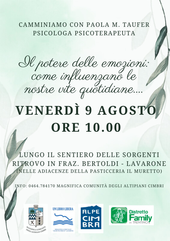 Il potere delle emozioni: come influenzano le nostre vite quotidiane. Camminiamo con Paola Taufer psicologa e psicoterapeuta lungo il Sentiero delle Sorgenti. Ritrovo: Lavarone Bertoldi piazzale Pasticceria Muretto Ore: 10.00. Gratuita. Info e iscrizioni: Magnifica Comunità degli Altipiani Cimbri tel. 0464 784170