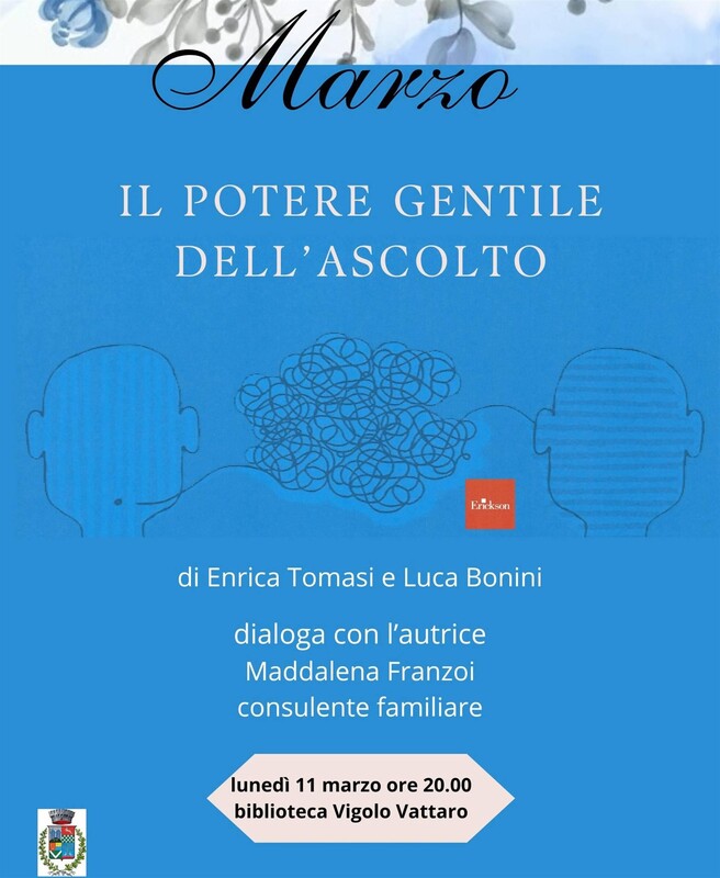 Lunedì, 11 marzo presentazione libro "Il potere gentile dell'ascolto" di Enrica Tomasi e Luca Bonini. Ore: 20:00 Luogo: Biblioteca Vigolo Vattaro Info: APT Alpe Cimbra 046472130 o info@alpecimbra.it